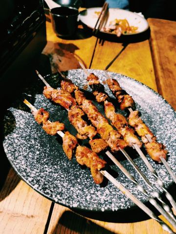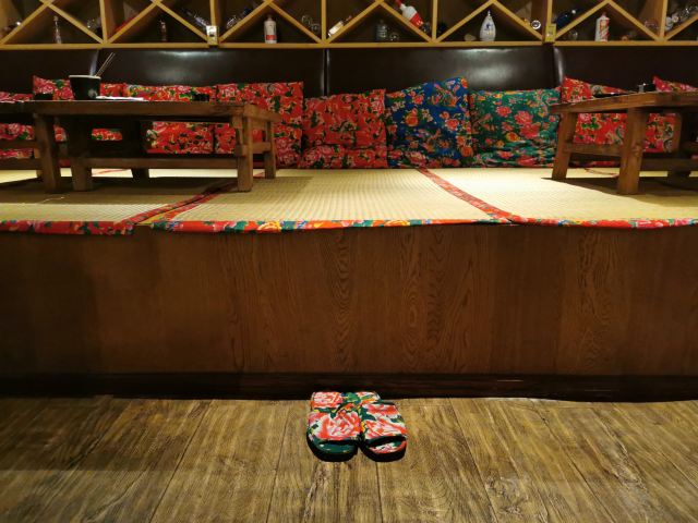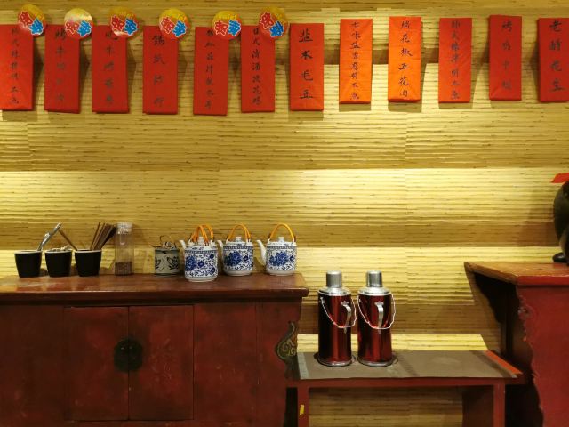 餐厅布置得相当有特色,木质的内饰,大大小小的烧酒坛,怀旧的餐具,让人错觉到了另一个年代。翻看菜单,发现价位很实在,完全可以按肚量来点一堆烤物,全然无压力。烤物香油入味,烤得恰到好处。