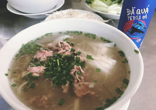 沿街店铺,只提供一种餐食即牛肉河粉,大碗5万越盾 小碗4万5越盾。桌上摆放着各种调料青柠也是自由取用~ 大小碗的分量其实相差不大,汤底清透鲜味自然透着淡淡的香料味,上桌后挤上柠檬汁再加入九层塔豆芽菜等就可以开动啦[小黄人高兴][小黄人高兴] 牛肉给得不少还带着半熟的粉嫩颜色,河粉本身超喜欢啊特别爽滑弹韧,带点汤一起吱溜一下吸进嘴里超满足~而且河粉没有面啊之类的那么占胃吃完也不会觉得太胀肚子! 不过这个价格按照当地定价还是稍微偏高的,芽庄到处都是吃河粉的店如果不是就近也不用特地来找这家啦