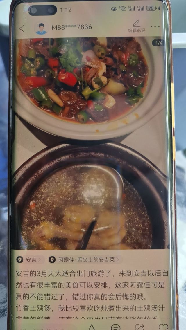 ALUJIA来安吉收获满满,快来分享吧 这次来安吉果然带给我的治愈感挺给力的,上一次来的比较匆忙,当时也错过了很多景点,也错过了很多美食餐厅,这次我是慕名而来的,不仅对美食进行全面研究,还对这边的餐厅也进行全面对比,阿露佳真是不错! 竹筒乌米饭。蒸出了软糯香甜的热气腾腾的搭配一颗红枣,吃起来带有枣香的香味的乌米饭,真不错! 安吉鲜笋煲,我也挺喜欢吃的,这个笋的分量不减速,看上去就让人很有食欲,和蜜汁的料汁融合在一起,笋吃起来比较爽口! 干锅黄牛肉这个牛肉也挺鲜美的,牛肉和料汁融合以后,这个牛肉吃起来简直不要太下饭,是一道不错的美食哦! 这家店里面的美食的分量总的来说挺多的,而且价格还不贵,上菜的速度也挺快,用餐环境干净而卫生,对这家店给出五星好评!