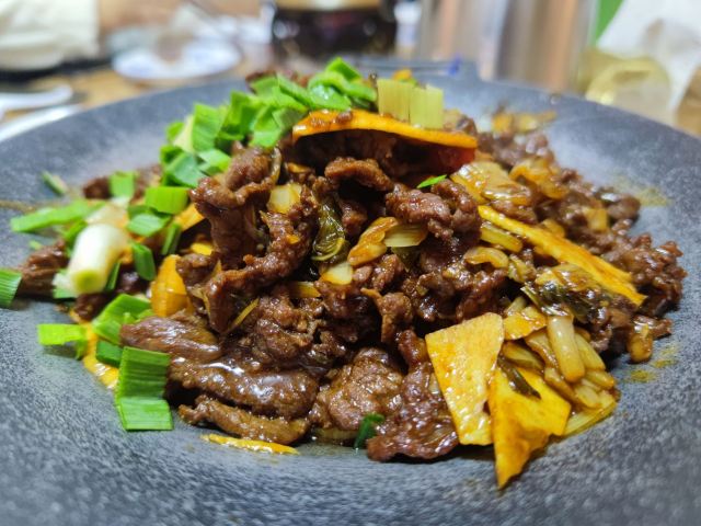 地地道道的安吉本地菜,非常nice的用餐体验! 位置在距离安吉高速入口不远的地方,从杭州或者湖州过来都很好找。 这家店的主打特色就是安吉的农家菜,食材新鲜,所以味道就非常好!进店的一楼,就有很多展示在保鲜柜里头的食材,河里的鱼儿,田野的野菜。 值得推荐的有这么两个菜吧。 1、红糖糍粑,这个是当地艾草做出来的,红糖炒豆粉,口感特别好,一桌一盘,一分钟吃完。 2、干锅黄牛肉,这个牛肉口感不错,做法很家常。