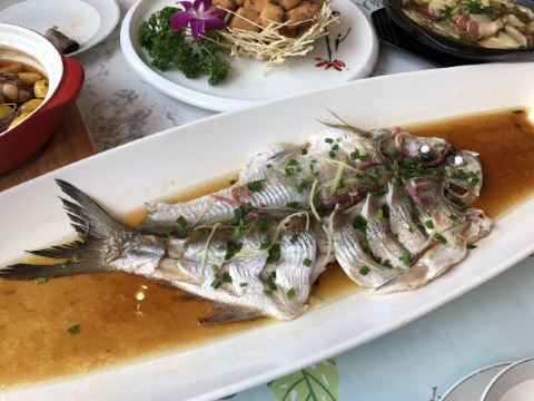 桐庐酒店的早餐吃的不落胃,退房后特地开车去富春江边上觅食。 点评上渔人码头的推荐度较高,跟着导航开过去。就在江边,露天景观座区域面积比较大,坐着吃饭可以欣赏一线江景,听服务员说晚上有歌手表演,更是热闹。 来桐庐必须要吃富春江里的鱼,因此第一个菜就点了火腿丝蒸白条鱼,鱼刺比较多,吃的时候要当心,但是鱼肉特别细嫩,又有火腿的鲜味儿。咸肉马蹄笋,也是很鲜美的一道菜。脆皮豆腐,酥脆好吃。