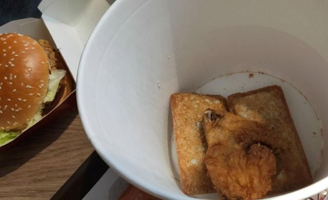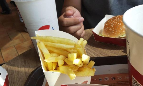 KFC超火~ 其实味道跟国内差不多。但是薯条好吃一点哦!加了芝士其东西~问题是,为什么要加葱 特别这里堂食炸鸡,都用个熟料篮~吃完以后自己放回回收处理。很环保! 新加坡在环保方面真的做的挺好的!