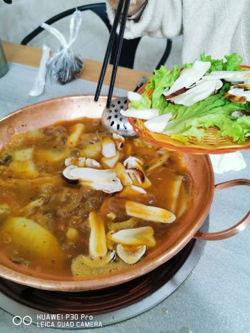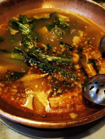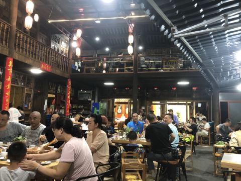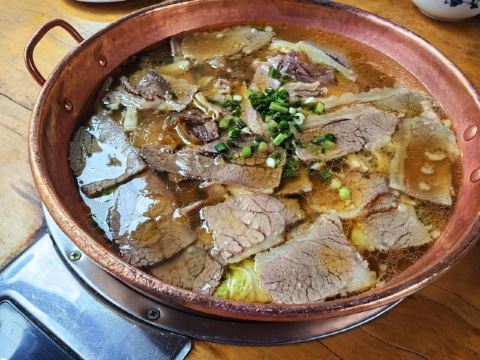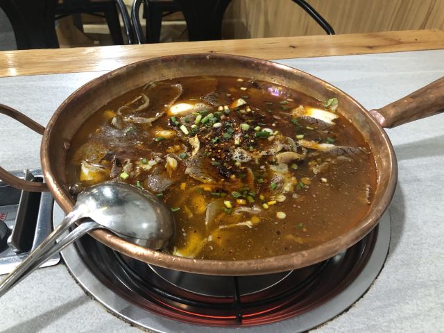 落地和顺古镇的第一餐 来的有些措手不及 因为酒店的房间还没打扫好 于是就决定先出来溜达一圈找点吃食再回去拿房 车把我们送到了正门口 这也是我唯一一次从正门口进入古镇 古镇其实还挺大的 找了一家相对就近的 |牛牛家铜瓢牛肉(和顺古镇店)^就是他了 其实到店的时候已经很晚了 大约下午两点多钟 但是店里依然人山人海 可见生意相当之好 好在这家地方够大 倒也不用排队 简单点了个套餐 配了些蔬菜 赶紧上! 有一说一 古镇人民还是很实诚的 这个牛肉锅的分量很实在 事实证明 只这一个锅就完全够了 味道还不错 值得尝试