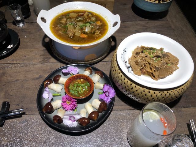 HUAJIE SIFANGCAI🌈花姐真的太让人惊喜了,这家私房菜就在和顺古镇内,我们买了两份单人套餐,餐厅给我们配了10个热菜,两碗鸡汤,两份甜品,还有玫瑰酒和饮料和水果。 🌿环境:餐馆开在一个带院子的老宅子里,都是包房,每个都挺有特色。 「燕窝桃胶银耳羹」非常棒!这个是最后上的,必须留着肚子来一碗。 「凤尾菇」这个菜以前没吃过,没想到炸过的菌菇也那么好吃。 「蒜香鱼」肉质鲜美,一点没有腥味,味道也非常好。 「菌菇炒腊肉」这个也挺好吃的。 「姬松茸炖牛肉」牛肉很酥,味道也好。份量两个人吃正好。 「松茸菇」滑嫩的口感,鲜美的味道,一口接一口,简直停不下来。 「猪皮冻」qq的,爽口中又带着韧劲。 「清炒南瓜苗」这个蔬菜是第一次吃,有丢丢像青菜,比青菜嫩,很好吃。 「玫瑰酒」还不错,略带甜味,真有玫瑰的味道。 「猪肉缅甸笋」这个笋吃起来有点像水笋,但是形状又不太一样,挺嫩的,也挺好吃的。 「养生鸡汤」鸡汤吃完可以续,里面除了鸡,还有虫草和菌菇,味道略淡,但是很鲜美。 「八宝饭」我没吃,小伙伴非常喜欢。 👩🍳服务也超棒!热情的不行。一直在问我,菜怎么样,要不要再加几个。实在是太好客了。