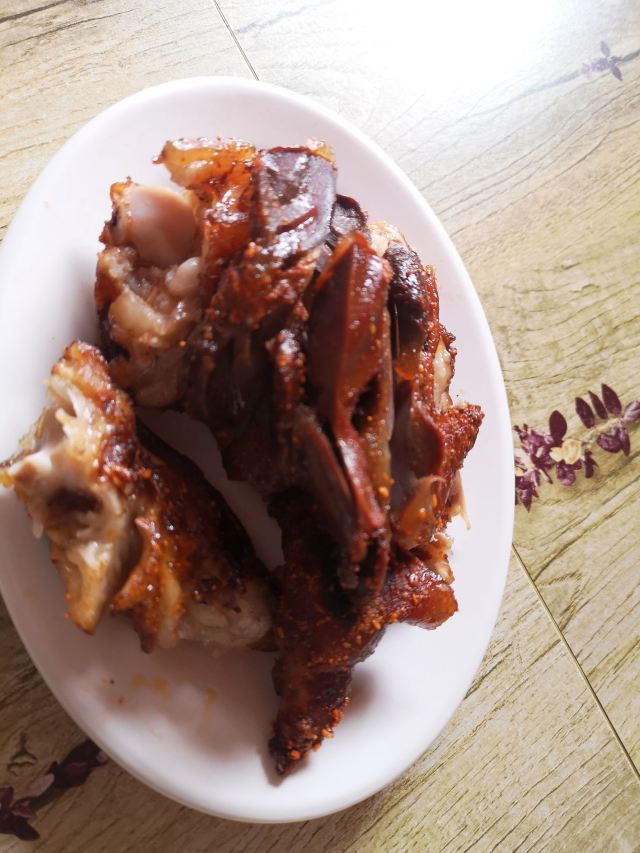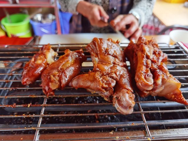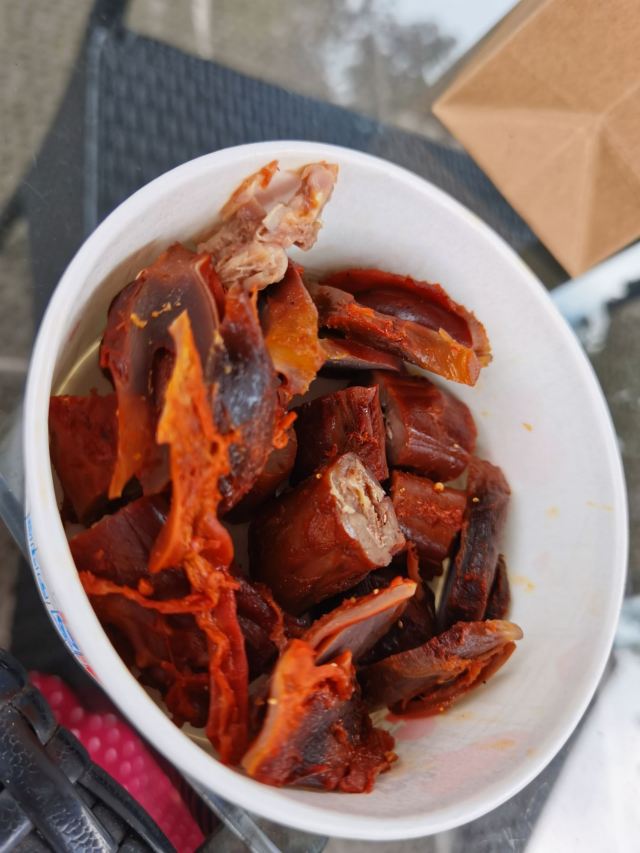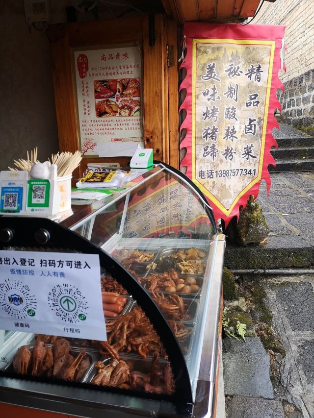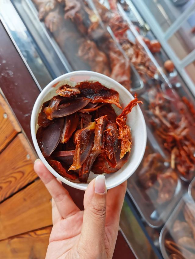 《4000公里一个月环游云南》 猪蹄好好吃啊,老奶奶好亲切啊,再打包点鸭脖鸭胗回民宿配着果酒看风景好爽呀😄 在古镇里其实也买过其他的卤味,真的远没这家好吃,所以如果路过真的推荐尝尝呦。 我们是在古镇入口景点里的摊子上买的(距离小造纸厂不远),这个点营业时间短点,镇子里面老奶奶家里也有卖,晚上也还能买到(可惜我们后来没找到😂)。而且好像也有外卖哦! 不过|烤卤猪蹄^还是吃现烤的最好吃,外皮有一点点焦酥,里面的肉则很软烂。 其他卤味比如|原香烤鸭脖^和|鸭胗^就不用加热啦,也方便打包带走,下酒很棒哦。