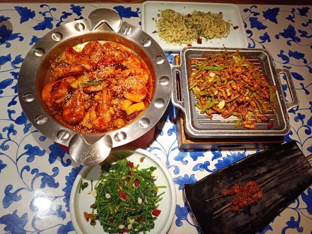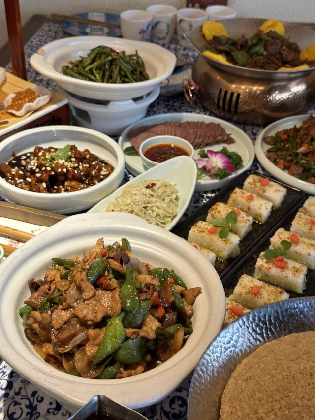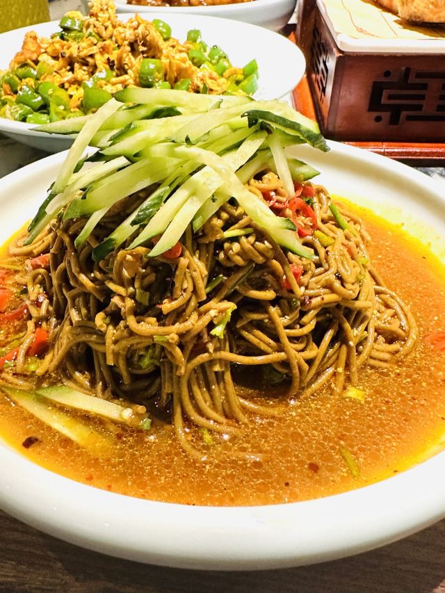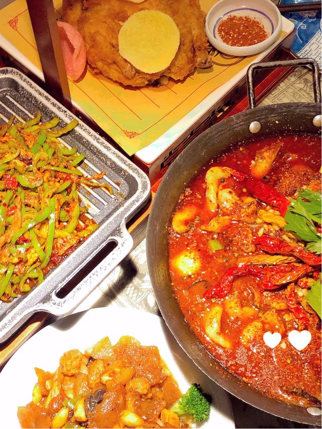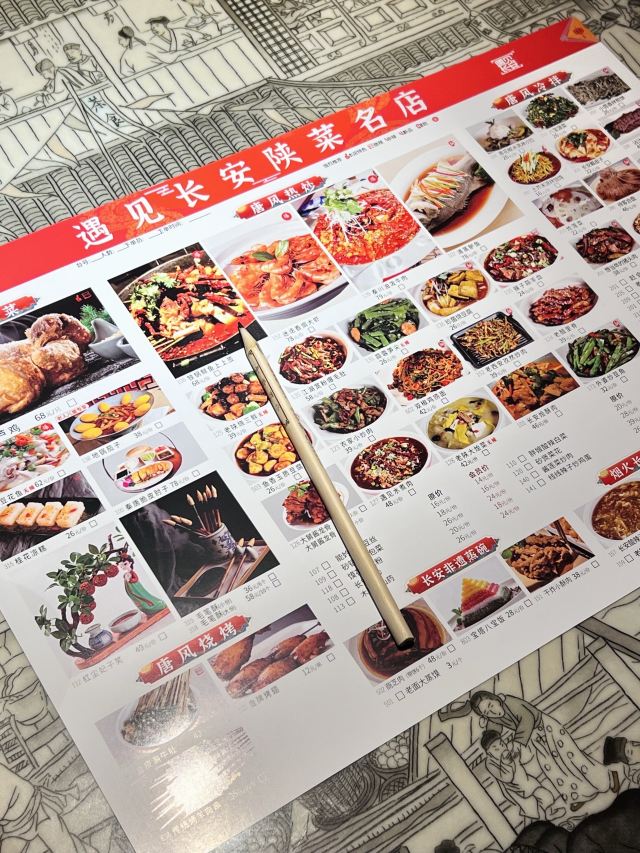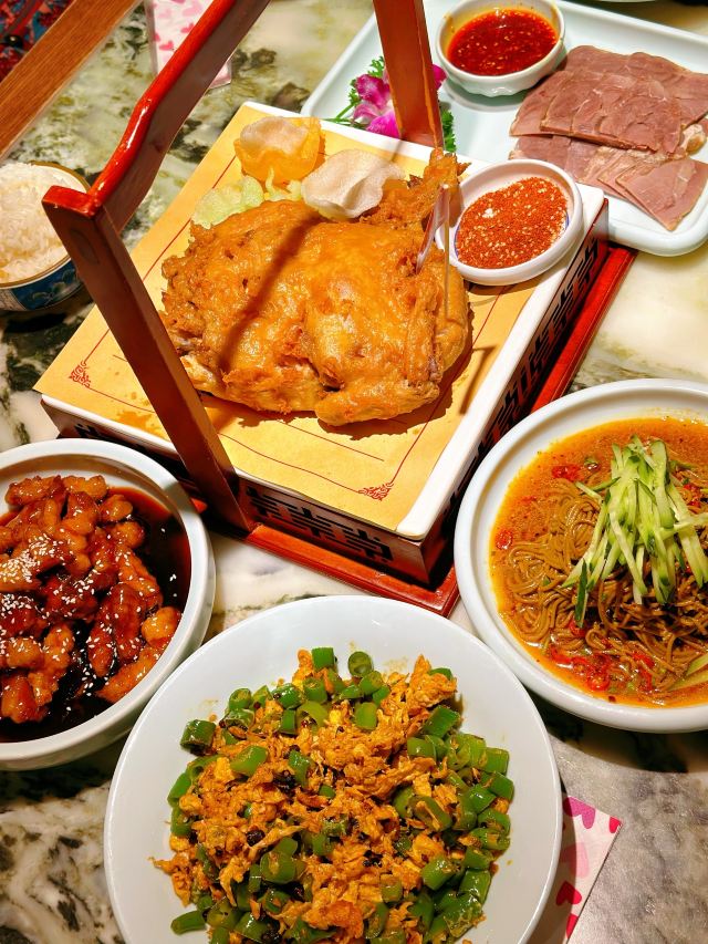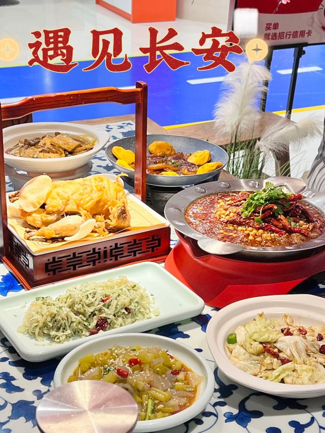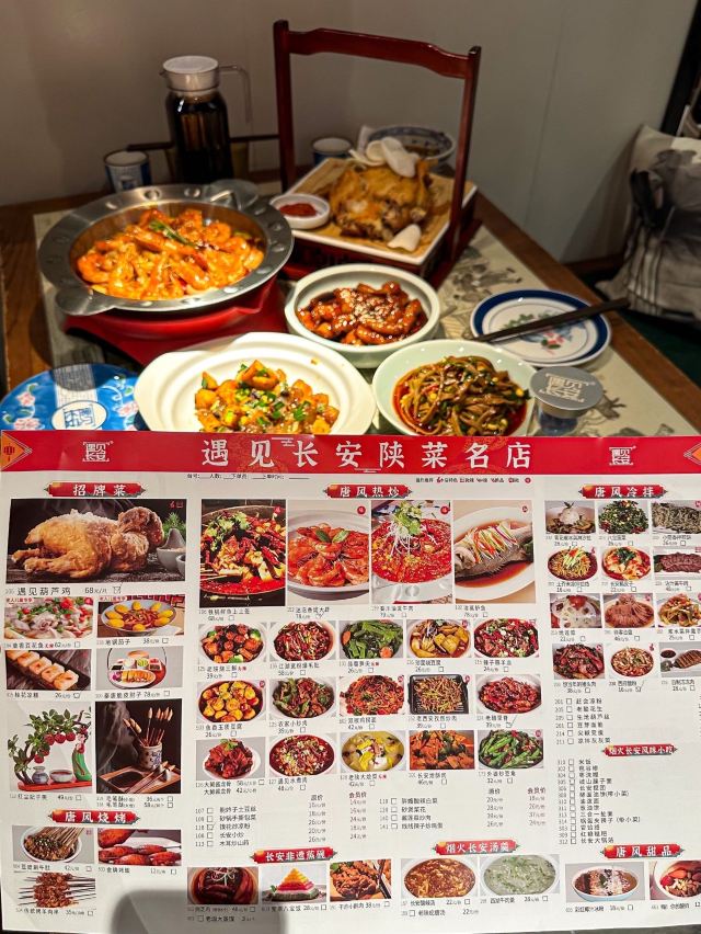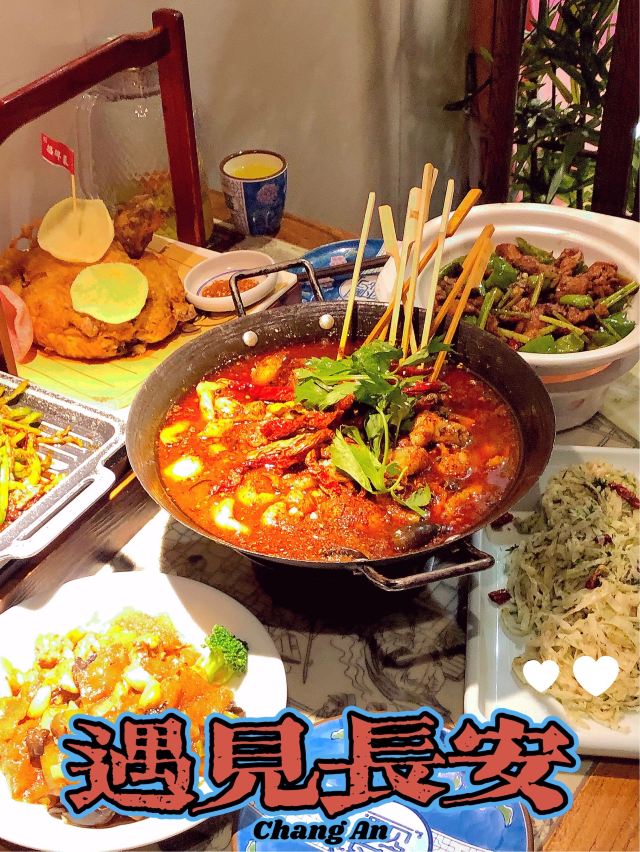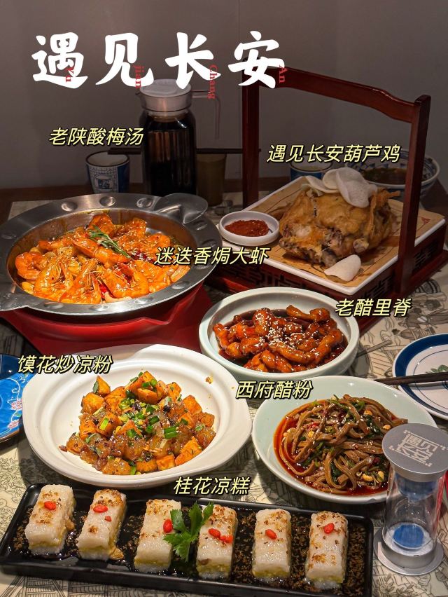 桂花凉糕,遇见长安葫芦鸡,铁锅鲜鱼上上签,韭香豆花鱼,小茴香拌煎饼,长安大锅贴,传统烤羊肉串,老醋里脊,毛笔酥,地锅茄子,烤肉,茴香拌煎饼,爽口葫芦丝,酵面油饼,锅贴