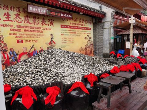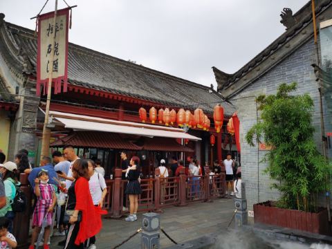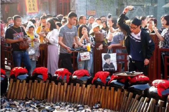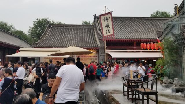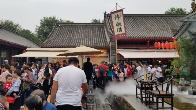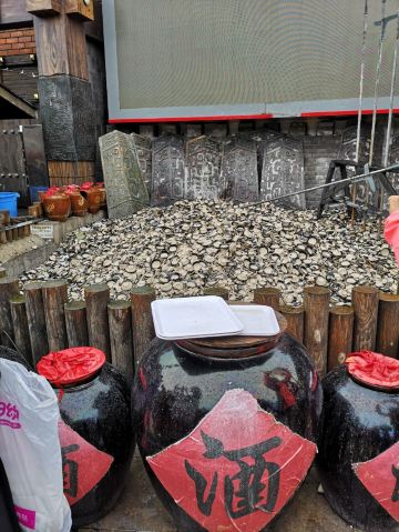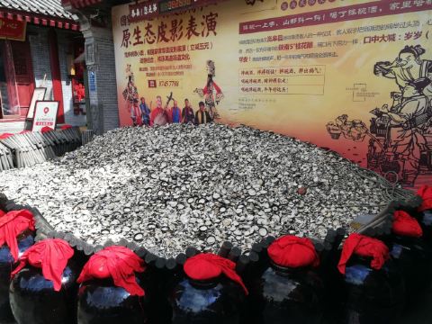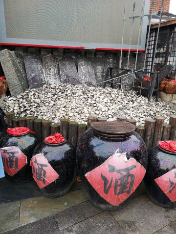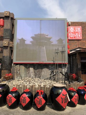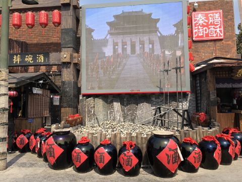 今天上午参观完兵马俑,以后就在附近找餐厅吃饭,结果看到了一个摔碗酒的标牌,挂得高高的,就好奇的走过去看看,发现酒桶围着的一圈里面全是摔坏的碗,到窗口去问了一下,才知道20块钱买三碗酒,吃完以后就把酒碗给摔碎,寓意岁岁平安。