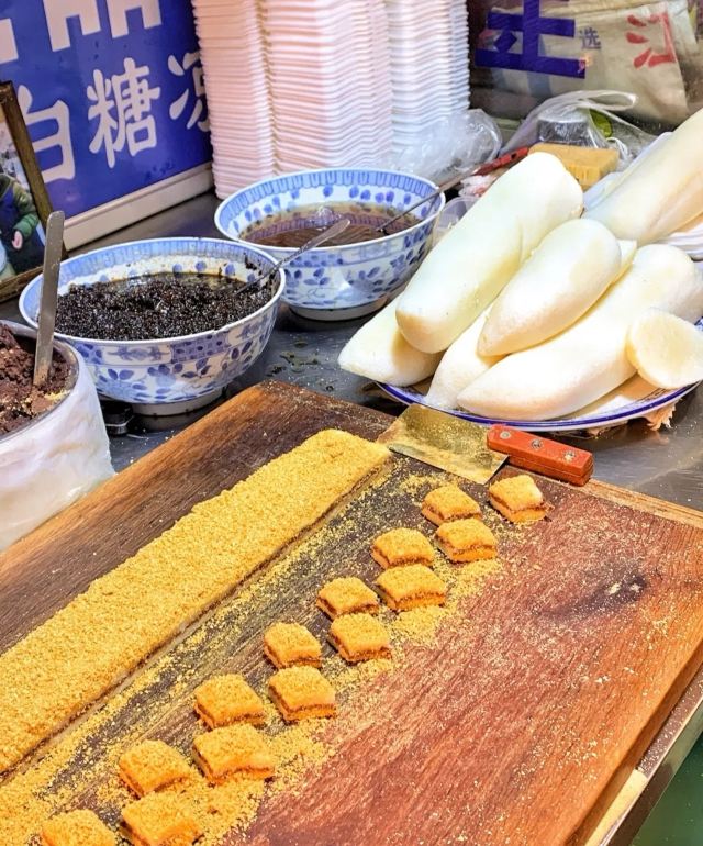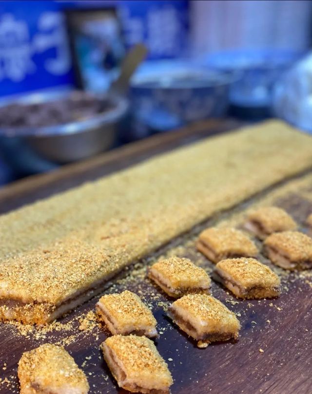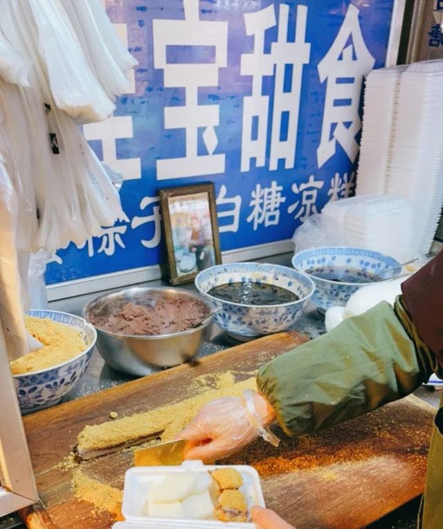 我太爱糯叽叽的小甜食啦 蜂蜜凉糕真的是西安街头小巷随处可见的特色甜点小吃。但特别有名气的应该算是回民街高家大院这的佳宝甜食了。虽然只是小摊子,但却是上过央视的口碑店家。价格也十分亲民,只要10元就能整整一大盒。 绵软的糯米抹上黄糜子,加入桂花调制成酱的蜂蜜浇在凉糕上。因为冰冰凉凉的所以一点也不会腻。是吃饱了依然觉得好吃的程度。 在春夏之际和嘴巴闲着的时候,一口黏糯香甜的蜂蜜凉糕正能恰到好处的带给人清凉舒爽的满足感。