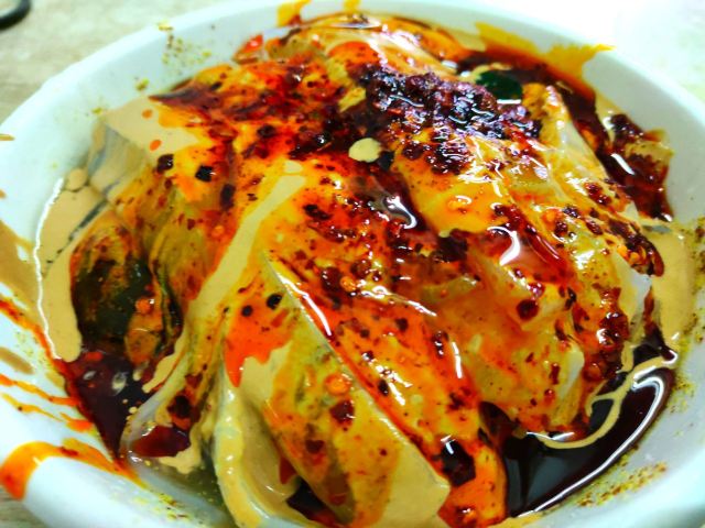 其实没什么特别的,就是在凉粉上加上芝麻酱。加上汁,然后再加上饼等。有点像豆花泡馍。