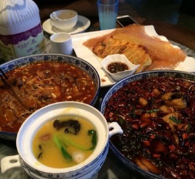 以陕菜为主的餐厅,位于西安市中心繁华的东大街上,店内装修颇为讲究,大厅很气派,有很多不同规格的包房,金碧辉煌,很适合做宴请。店内的陕西菜口味不错,葫芦鸡不得不吃,biangbiang面、肉夹馍等当地口味的菜肴也做的有模有样。