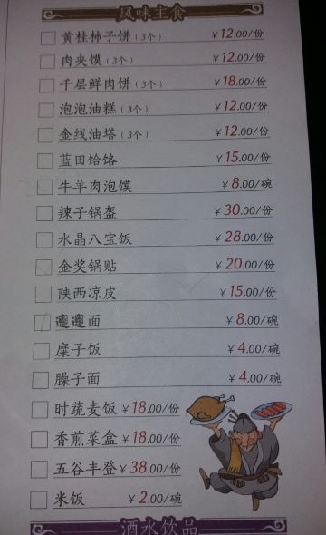 醋泼秦川肉,金线油塔,金钱油塔,肉夹馍,黄桂柿子饼,菊花鱼,陕西酱牛肉,葫芦鸡,牛羊肉泡馍,小酥肉,biangbiang面,松鼠鱼,手抓羊排,糜子饭,牡丹腰丝,金奖锅贴,泡泡油糕,西安凉皮,臊子面,羊肉泡馍,油泼面,温拌腰丝,凉粉,包子,锅盔,盘丝饼,小米南瓜粥,老碗鱼,龙虾球,菜团子,烤羊排