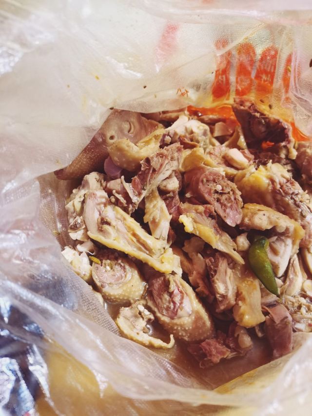 没有店面,就是一个三轮车的流动摊子,头一次见到的时候是因为围了好几个人在买,挺好奇的,这么一个流动摊子咋还买的人挺多的,后来又一次路过这里,看到了,就很想感受一下了,然后给老板说弄上半只,一只咱吃不完的,老板手很麻利,克利麻擦的剁了半只,上称,26元然后简单的分切和去骨就装到塑料袋子里面了,最后用勺子淋了一勺他们锅里的汤,回去后赶紧打开常,味道确实不错,很香但可能火候的问题吧,鸡肉不那么酥烂,有些柴吧,不知道这个是他们故意的还是确实火候没把握到位呢?希望以后能更加改进吧