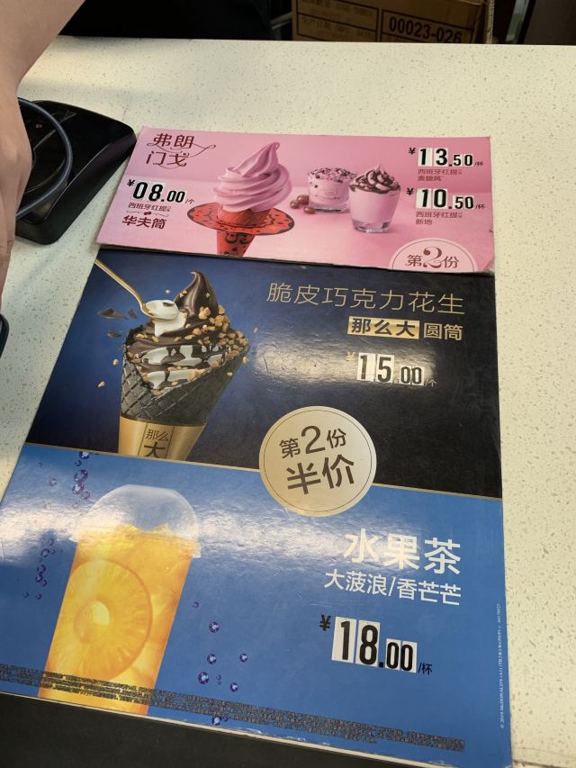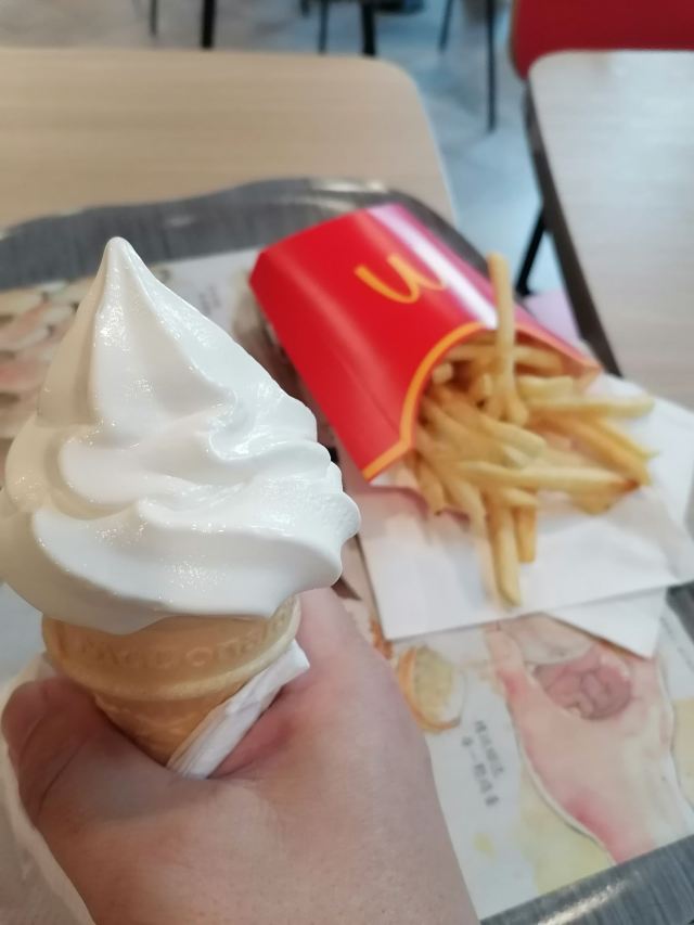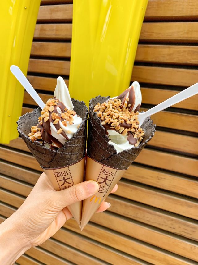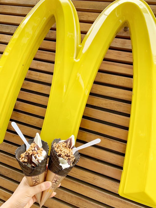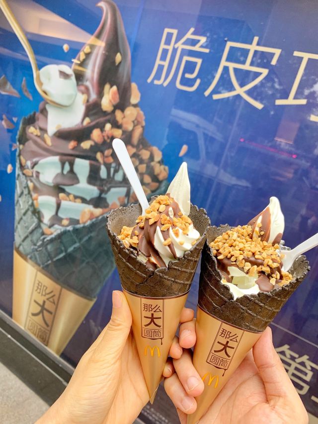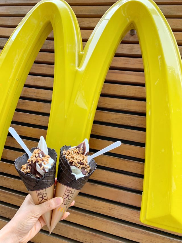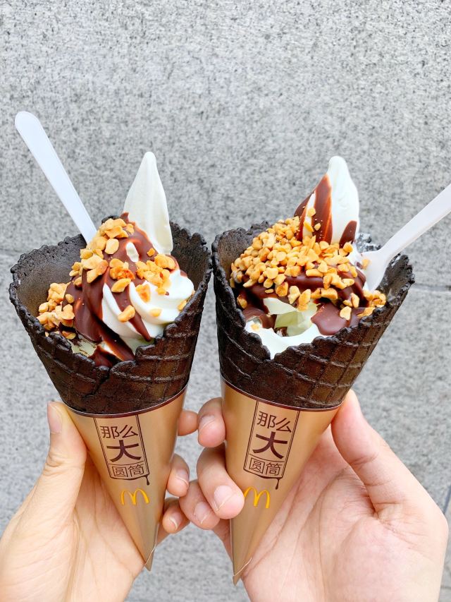 摩小亚在西安真的每天都在 暴走,从早走到晚,除了吃饭的时候有短暂的坐下,其余时间都在站立行走中,所以每天微信运动都是三万多步,到第四天脚都差不多报废了。 第三天下午,走到鼓楼的时候,有些想吃冰的,看见麦当劳有红提冰淇淋新品,颜色很特别,就想试试看。 可是排队到了点单窗口,店员说机器坏了,红提口味还没办法做,只能点其他的。 好吧,妥协了,选了另外一款海报新款 -- 【那么大脆皮巧克力冰淇淋】15元一支,第二支半价。 明明觉得一支就行,但是考虑到不能不占便宜,所以买了两支。哈哈哈,小亚的贪婪心理啊。真是不可思议! 首先这个大圆筒,比一般的甜筒要大一些,再就是蛋卷也更脆,虽说是原味 冰淇淋,但是外面淋了巧克力酱,遇冷就凝固了,然后成了脆脆的外壳,还有撒了花生碎粒,总体口感是真的还不错,吃完一个有满足感,吃完两个满足感爆棚呀。哈哈。 两个22元,还是不错的。单个15元,我觉得略贵了点。