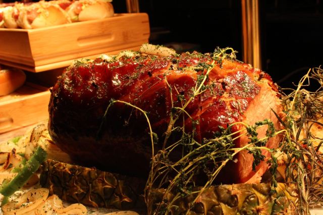 意大利蔬菜汤,海螺,悦椿海鲜披萨,烟熏三文鱼芦笋卷配黑鱼籽,传统凯撒色拉,花蛤,面包,香浓咖喱牛腩,小火锅,羊排
