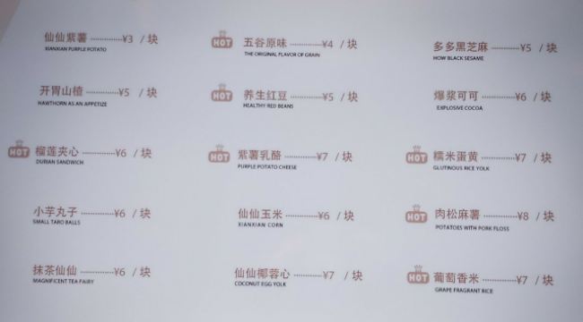 浓香黑芝麻,浓情紫薯,榴莲夹心,经典原味,肉松麻薯,抹茶红豆,血糯米蛋黄,养生红豆,爆浆可可,紫薯、黑芝麻乳酪,紫薯乳酪