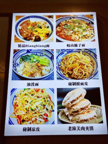 肉干拌,肉夹馍(优质),精品biangbiang面,酸梅汤,油泼面,老潼关肉夹馍,岐山臊子面,腊汁肉揪面片,三合一,面食,面汤,秘制擀面皮,biangbiang面,果啤,酸汤面,大肉干拌,蒜蘸面,蘸水面汁子,素拼,西红柿鸡蛋面