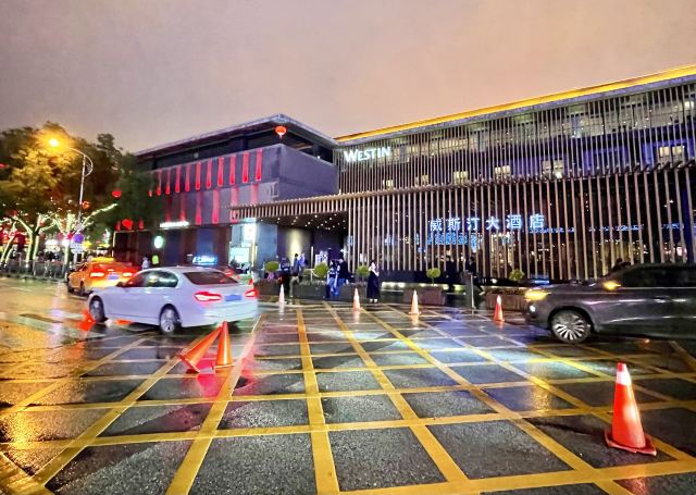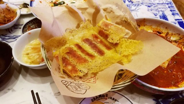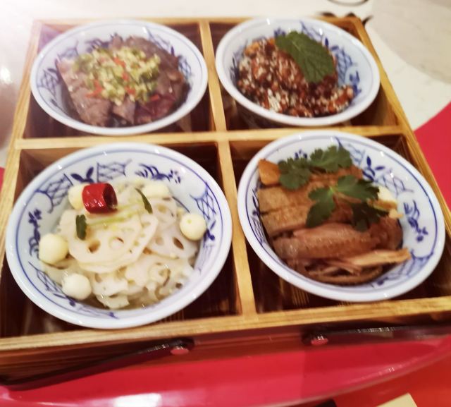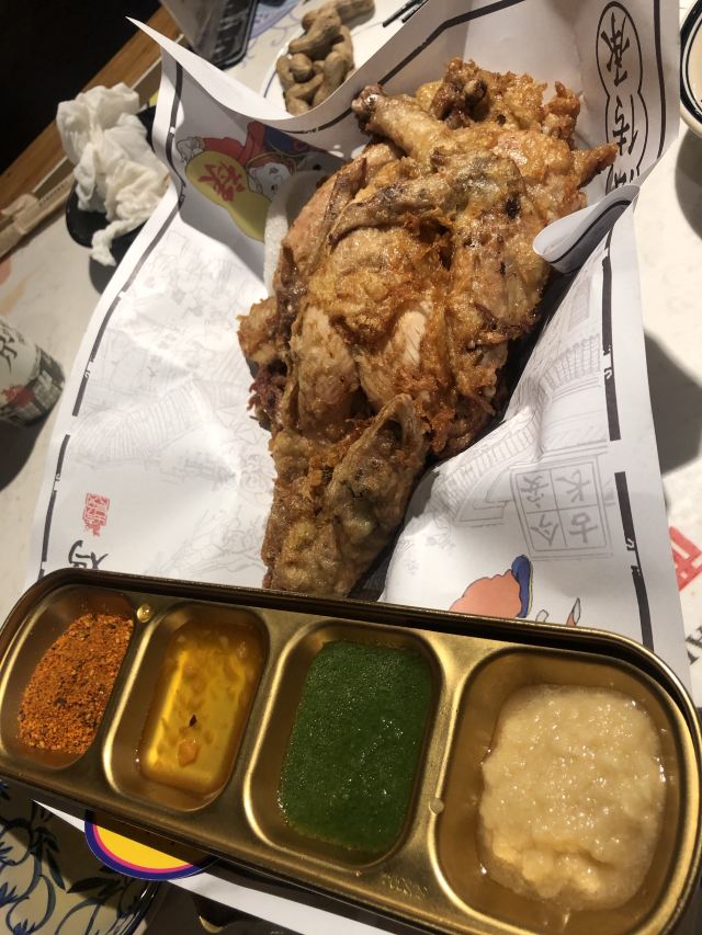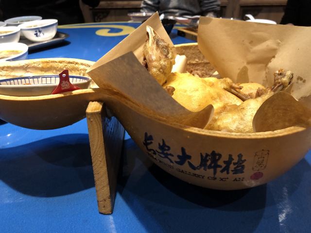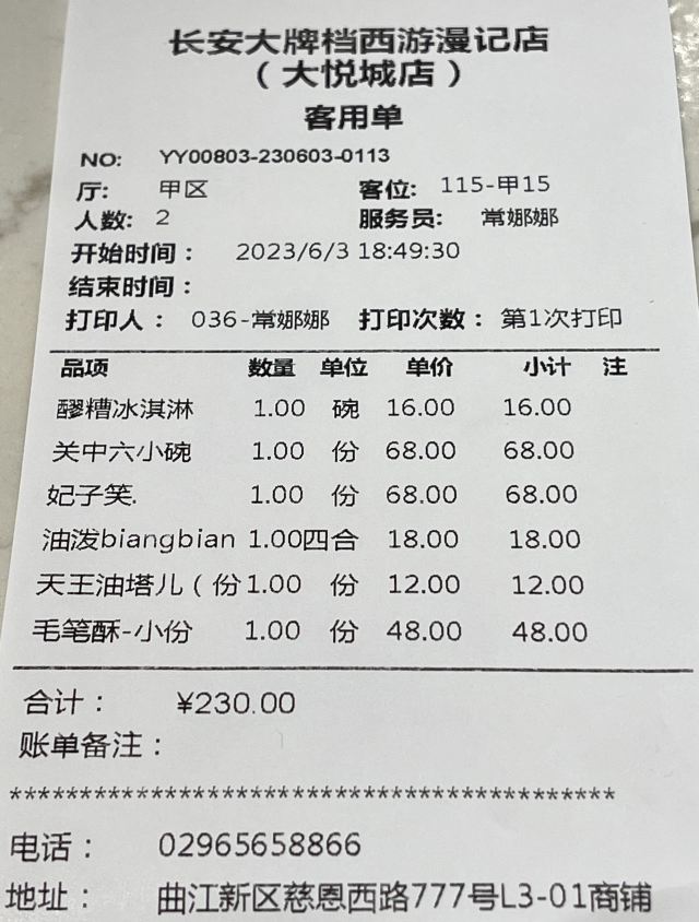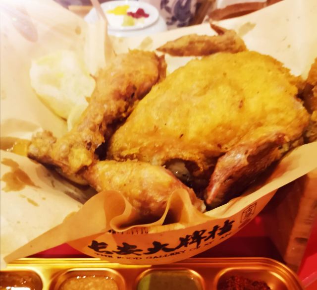 THE FOOD GALLERY OF XI'AN XI YOU MAN JI去西安旅游,出发前就选了这家。据介绍这里可以看大雁塔、西安夜景;还可以见识一下西安大牌档的菜品小吃。 提前一天定位就没有包间了,大堂不定座,届时排位。当天5点半左右就到了,还没怎么上客,门口等候区有免费的茶水和多种小点心,叫到号会敲锣执旗带客入座。6点以后等候区人渐渐多起来,开始叫号我们就进店了,点菜开饭:妃子笑是必点的,毛笔酥没点(感觉吃起来会怪怪的),另点了一些陕西特色菜和小吃,味道都挺不错的。妃子笑没有特别好的味道,胜在造型。点的女儿红和桃花吟味道都还不错,还有赠送的小点心和冰糖梨露。 晚七点有演出,“嫦娥”飘飘餐桌间。嫦娥很亲民,不拒客人拍照要求。 大悦城四层观景平台高度虽有限,夜景还是不错的。