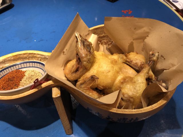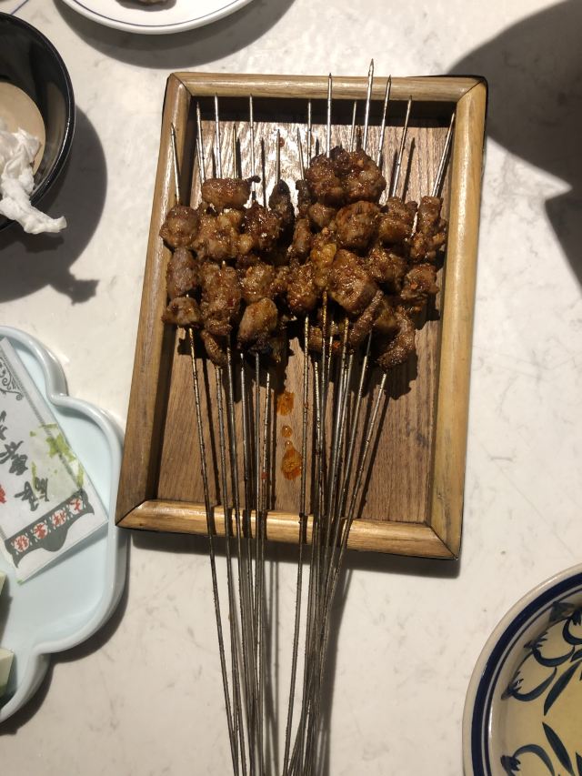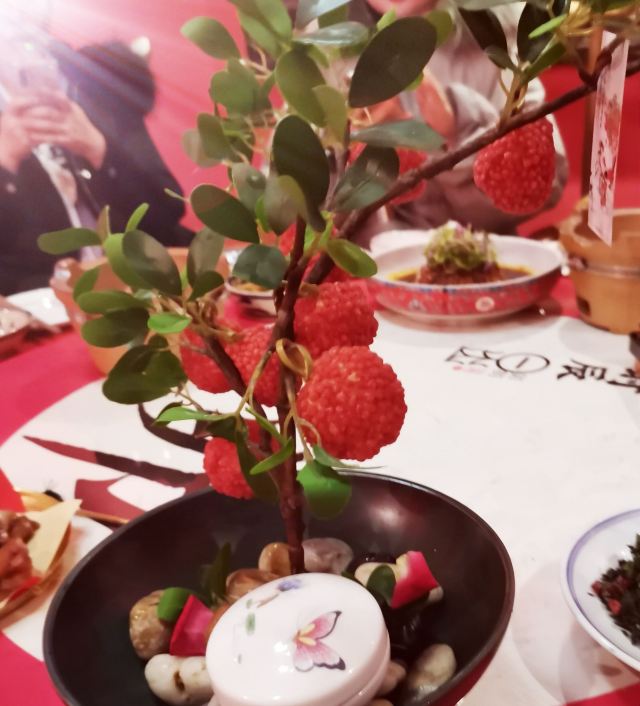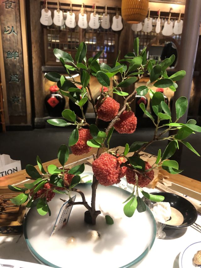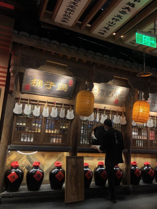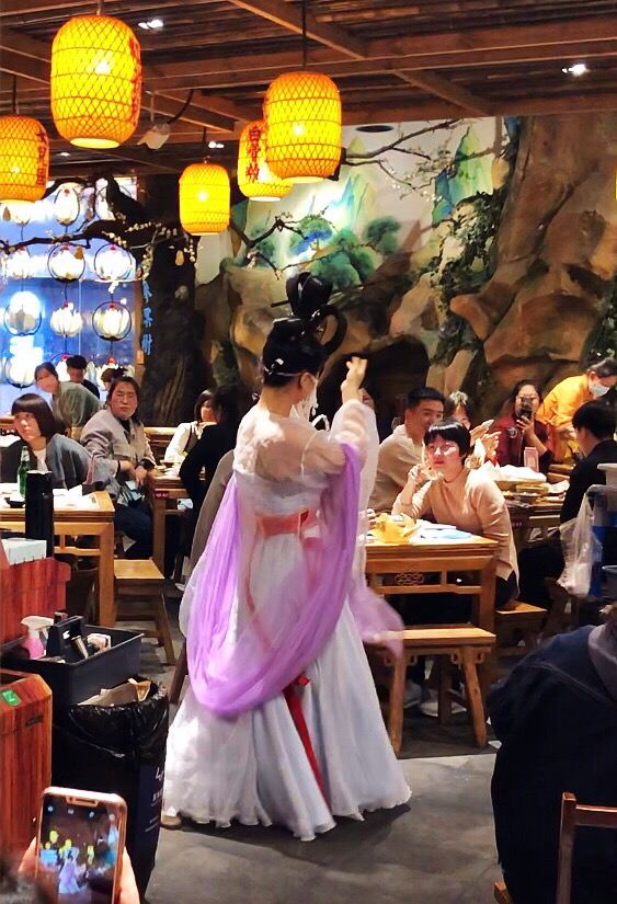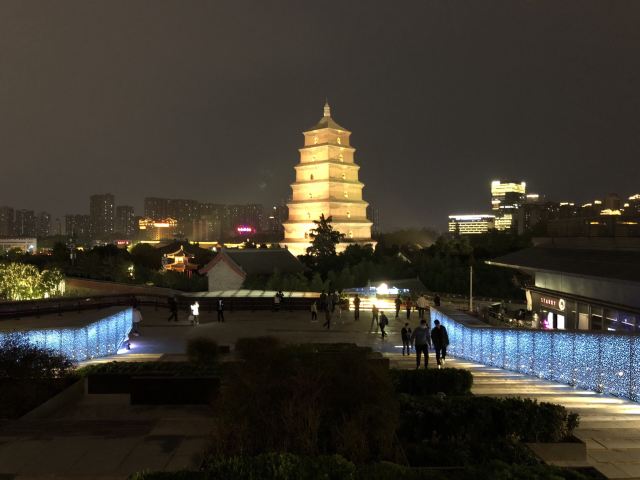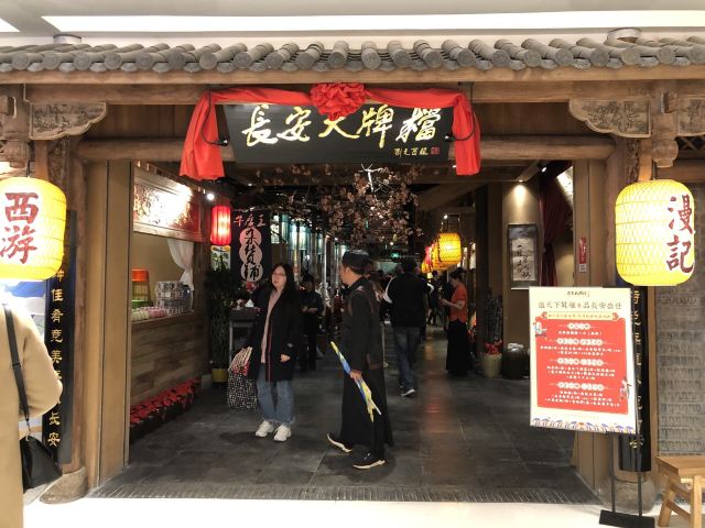 徐团去西安旅游,出发前就选了这家。据介绍这里可以看大雁塔、西安夜景;还可以见识一下西安大牌档的菜品小吃。 提前一天定位就没有包间了,大堂不定座,届时排位。当天5点半左右就到了,还没怎么上客,门口等候区有免费的茶水和多种小点心,叫到号会敲锣执旗带客入座。6点以后等候区人渐渐多起来,开始叫号我们就进店了,点菜开饭:妃子笑是必点的,毛笔酥没点(感觉吃起来会怪怪的),另点了一些陕西特色菜和小吃,味道都挺不错的。妃子笑没有特别好的味道,胜在造型。点的女儿红和桃花吟味道都还不错,还有赠送的小点心和冰糖梨露。 晚七点有演出,“嫦娥”飘飘餐桌间。嫦娥很亲民,不拒客人拍照要求。 大悦城四层观景平台高度虽有限,夜景还是不错的。