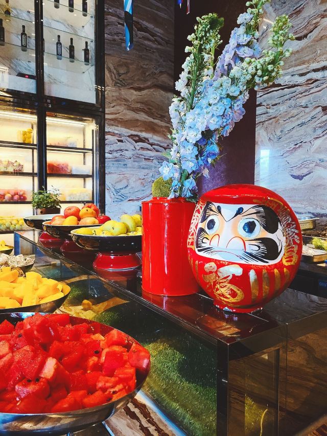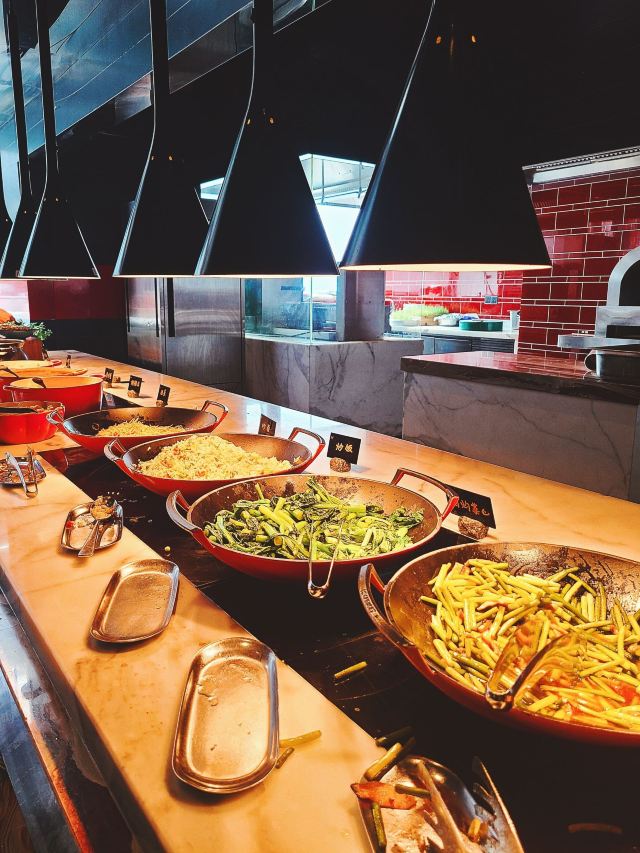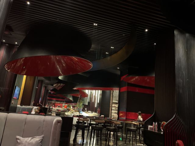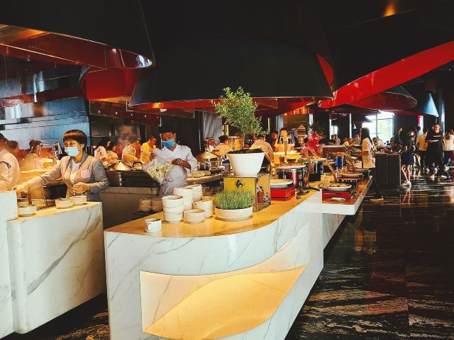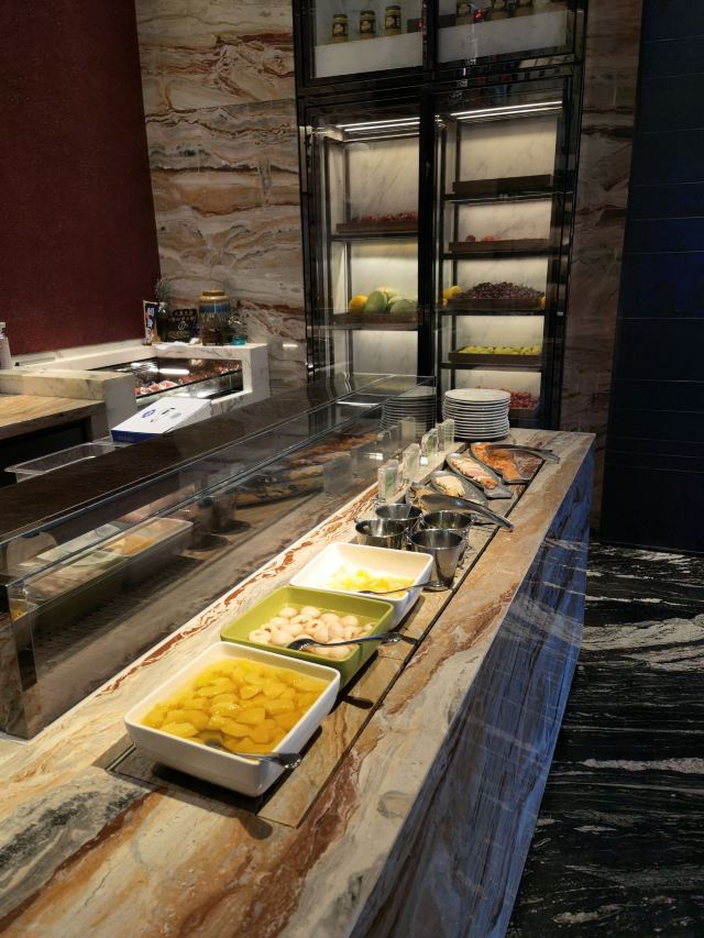 餐厅以黑灰银为主体颜色,宽敞整洁。这里提供自助餐,品种多样,海鲜、烧烤、甜品、刺身等应有尽有,色香味俱全。烤肉系列颇受欢迎,搭配烤肉酱料,口感极好。
