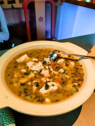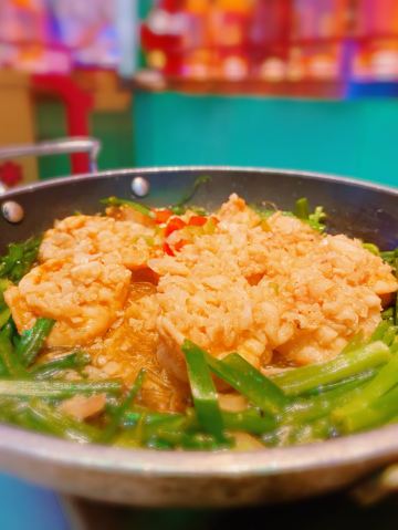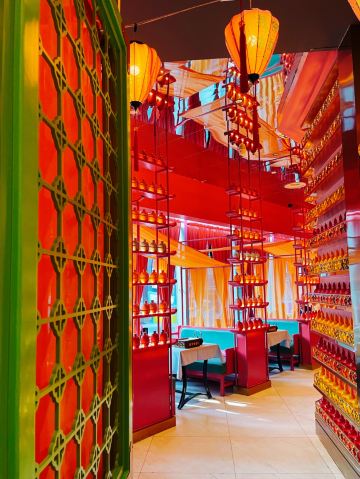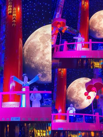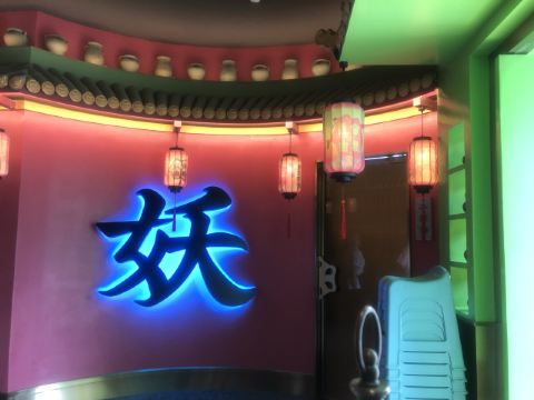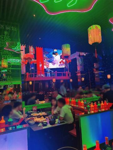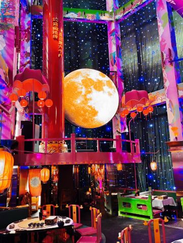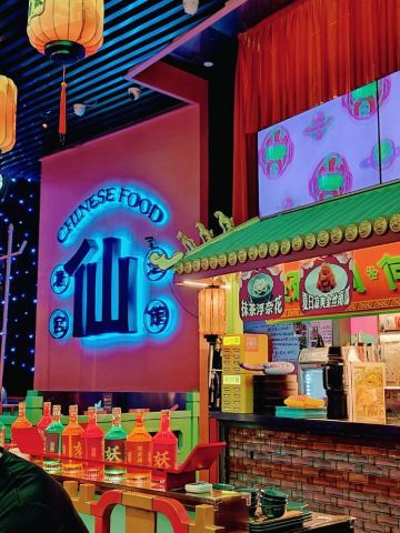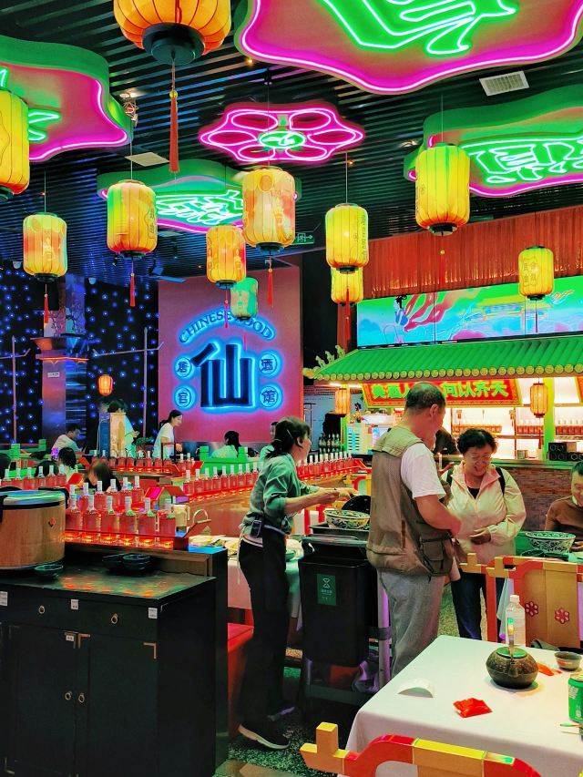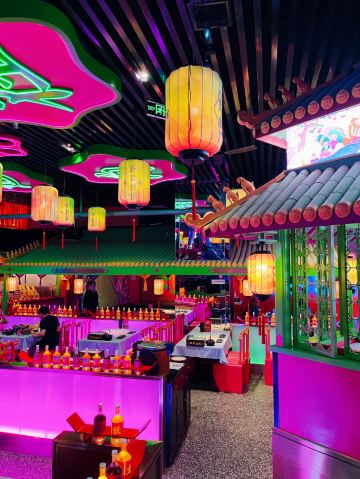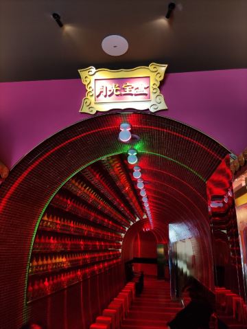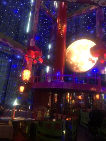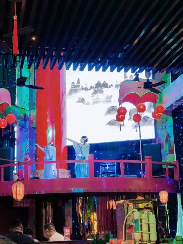 朵朵白云曲江创意谷最火的餐厅当属这家店了,和闺蜜逛完街毫不犹豫的选择了这家店,还好去的时候是下午四点多,人少位多根本不用排队等候,但是也错过了酒馆的演艺时间。 🌟⏩:环境服务:唐宫酒馆的店铺装修是噱头,红黄绿搭配是主色调,顶棚用丝绸帐幔搭建,绿色门栏窗棱,黄色灯笼。最里面超大的月亮做舞台背景,墙壁上挂的蓝色星幔,整个店内五颜六色喜气洋洋真如唐宫一般景象。中午和晚上都会演员穿着唐装演艺节目。 🌟⏩点单推荐: ✅我命由我大辣炒鸡:招牌菜,点单之前询问了服务员,这道菜看起来超辣,吃起来也会很辣,特意在点单时备注了微微辣,但是还是挺辣的,不能吃辣的朋友还是放弃吧。 ✅蒜香粉丝虾:剥了皮的大虾,上面铺满了蒜蓉,周围用绿色的韭菜点缀围了一圈。韭菜和蒜蓉是生的,下面有炉子加热煮熟。 ✅桂花凉糕:吃完辣子鸡吃一口甜甜糯糯凉凉的桂花糕,刚好可以去辣爽口。凉糕是糯米上面铺了一层小米,再浇上蜂蜜、撒上桂花。 ✅荞面饸饹:和正宗的荞面饸饹口感差了些,没有什么特别。 ✅其它推荐:可以尝尝陕西的烤串,烤翅和油泼面。