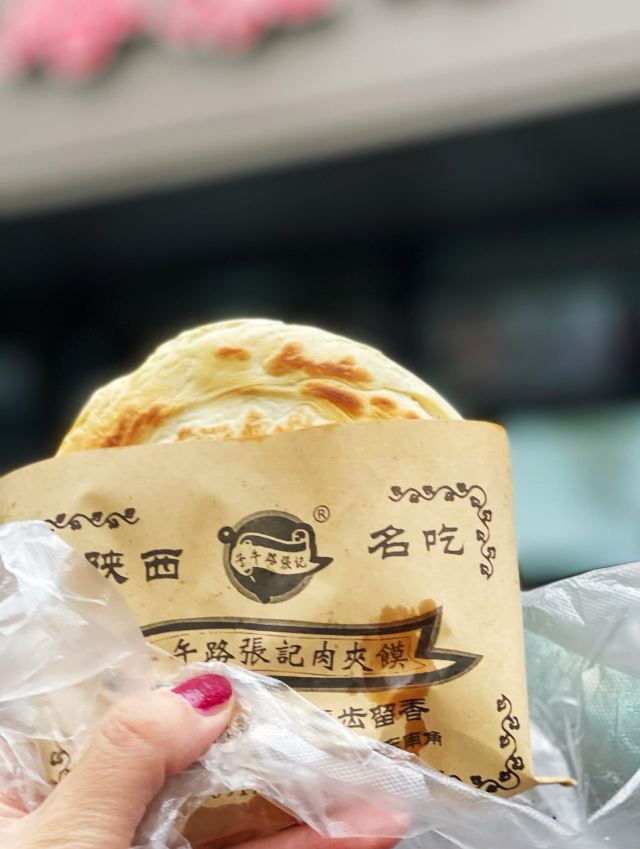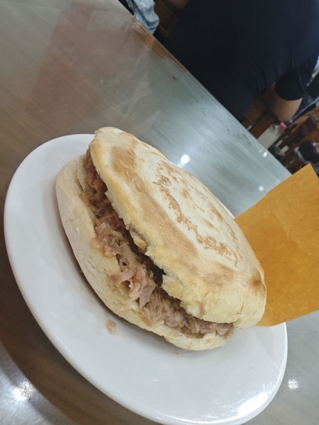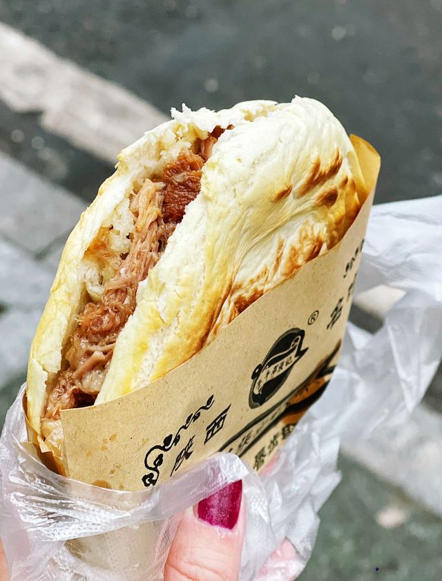 早上快九点去的 还没营业 等了一会 优质肉夹馍15一个 里面肉真的很多 饼皮是有点脆的 汁水很多 两个人吃一个正好