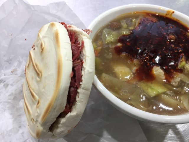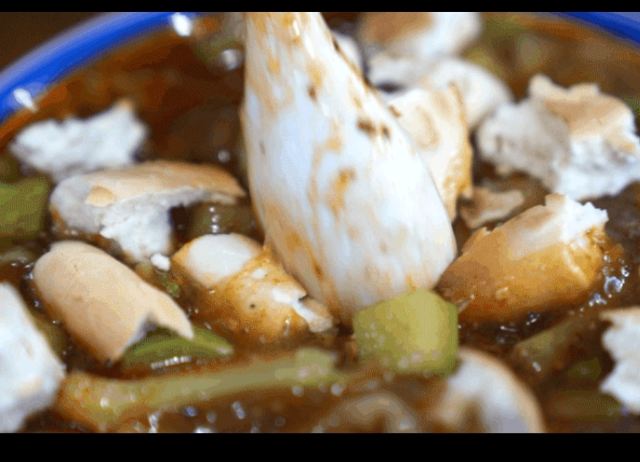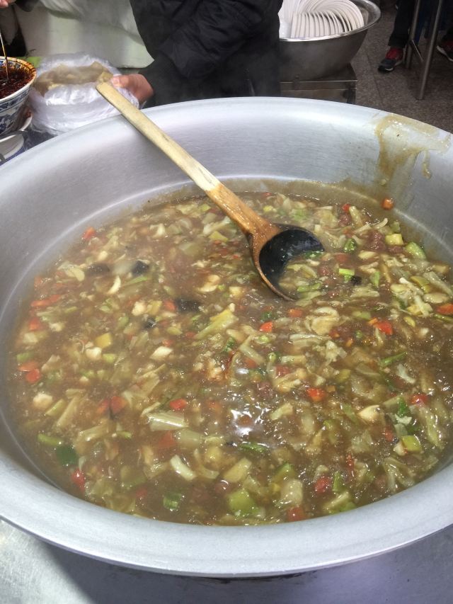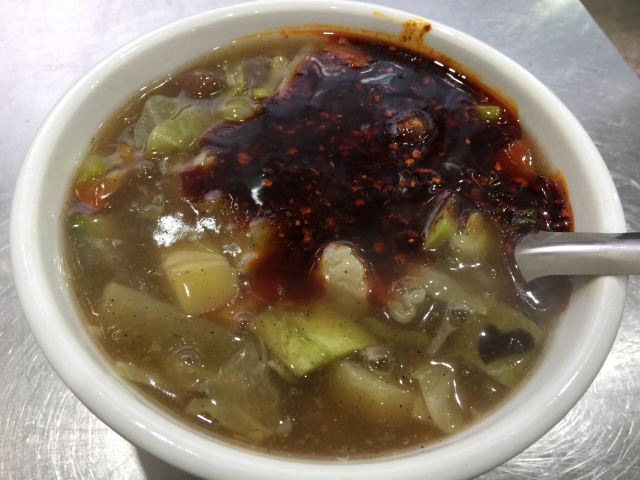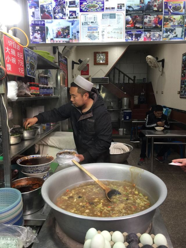 回民街上生意火爆的糊辣汤店,每天凌晨开张,到中午就停止营业,很多本地人也会天蒙蒙亮就过来排队。糊辣汤里除了牛肉丸子,还有很多蔬菜,如胡萝卜、西葫芦、卷心菜、土豆等等,汤中加了辣椒和花椒,麻麻辣辣的,再加一个馍,吃的热乎乎的,价格还相当的实惠。