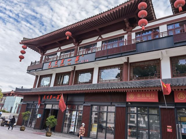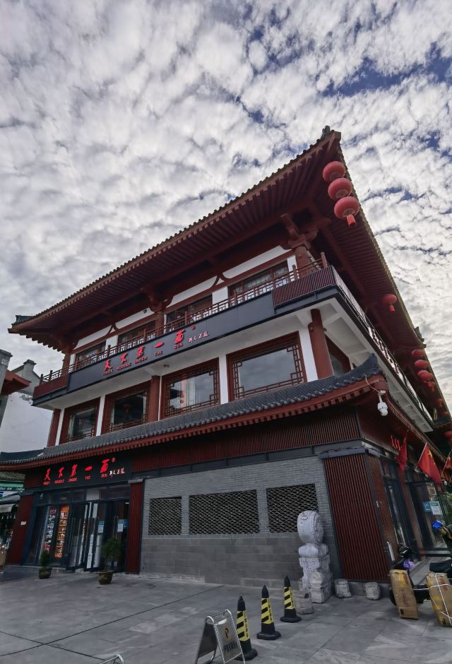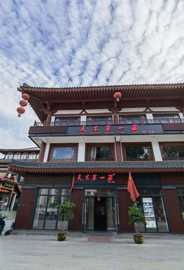 西安著名景点大雁塔附近的一个面馆,天下第一面招牌很大,是由陕西的大画家刘文西题写的。店面大气明亮,装修富有中国风。 店里的招牌自然就是独创的天下第一面了,一碗面两碗汤,一碗南方海鲜营养汤,一碗北方酸辣臊子营养汤。一碗面里只有一根长3.8米的面条,寓意有三,一是2000年3月8日研制成功,二是三秦八百里平川,三是三千八百万陕西人民。把汤倒入面中吃,很有特色。另外,西府臊子面、biangbiang面、油泼面、腊汁肉夹馍等都是陕西风味。