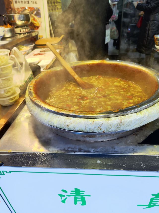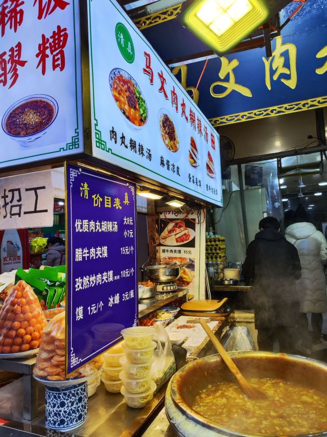 过年的时候回民街的人那叫一个多。首先要吃的是肉丸胡辣汤,正好碰到这家清真马文肉丸胡辣汤,来一碗吧,再来一个腊牛肉夹馍,完美的一顿早餐。