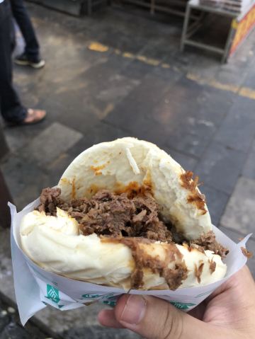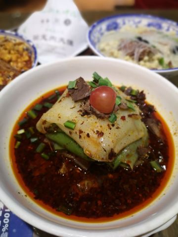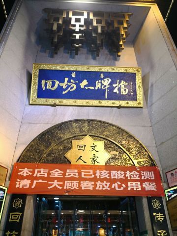可以说这是我去过的回民街店环境和服务最好的一家。地址在北院门111号(回民中学南隔壁),这里是西安最火的回民街,所以建议徒步走去[呲牙] 门口这些老外是刚才里面吃完饭出来的,满脸的满足。 店里装修古色古香的,木制桌椅,彩色宫灯,很有地方特色。 店里人山人海,座无虚席。服务员招呼我们坐下,点好菜,就又开始忙碌别桌的顾客了。 上菜速度很快。|腊牛肉夹馍^外酥里嫩,肉质松软,份量很足。|羊肉泡馍^和|小炒泡馍^的碗不像别的店里那么大,但是份量也很足,小炒更加重口味一些。|三色凉皮^色泽不是很鲜亮,但是味道不错,很劲道。