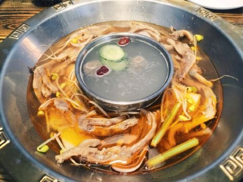 「鸭掌汤锅」「撒尿牛丸」鸭掌火锅必然主角是鸭掌,老板娘说鸭掌都是提前炖好用草药去腥,确实吃起来不会有鸭骚味,口感适中,很柴,一泯鸭肉就骨肉分离了 反正我每次吃火锅,蟹肉棒,豆腐皮都是必点菜品