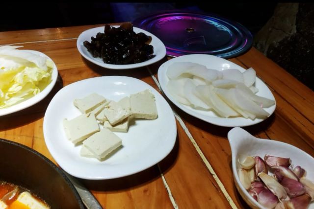 铁锅羊肉,看着辣椒很多,其实不辣,小朋友也可以吃,羊肉是横山的羊肉没错,剁的比较碎,味道正宗,略微肥了一点。 涮菜榆林豆腐,粉条都是陕北的味道。 炸年糕,口味还行,就是差点火候。 扯面,很劲道,吃着很有感觉。