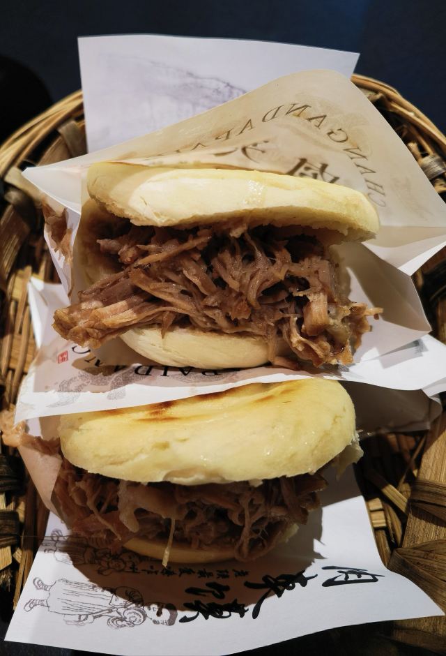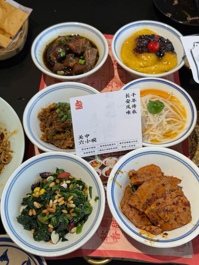 Chang'an Food Court: SHAN LI BO WEN HUA CAN TING长安大牌档在小寨赛格广场6楼西北角类似于南京大牌档,装修风格也一样,既然来到西安就必须要来尝尝。地方不是特别好找,店面非常大,很有气势的感觉。 服务员们穿着民国风的服装,顾客进门所有服务员都会一起喊欢迎光临和一些吉利话。在西安光小吃就已经多到需要多带几个胃吃,这里是唯一一顿下馆子的正餐。招牌长安葫芦鸡,一整只小鸡去了头尾炸制而成,放在半只葫芦里摆盘,皮脆肉嫩,非常好吃,就是有些略油。 酒酿冰激凌第一次吃到,很特别,味道也不错。西府一口香,其实就是6碗哨子面,每碗都是一口的量,酸酸的,很开胃爽口烤枣馍,酥酥脆脆的很好吃,但多吃几个就塞饱了烤羊肉,不推荐的一道菜,太老筋太多,也不知道是不是批次的问题