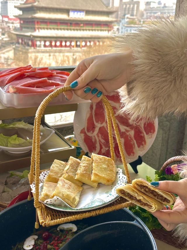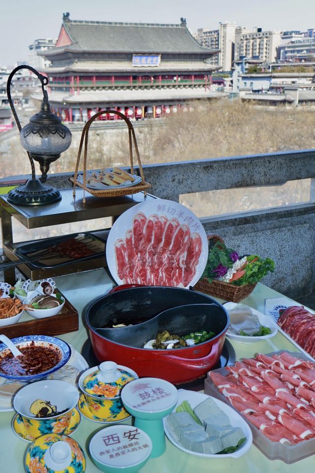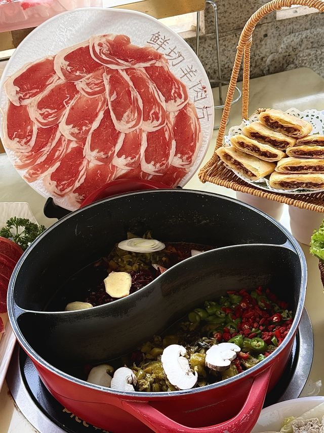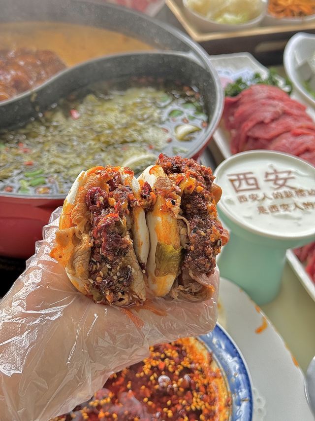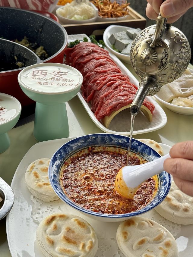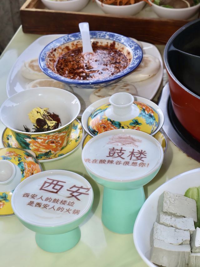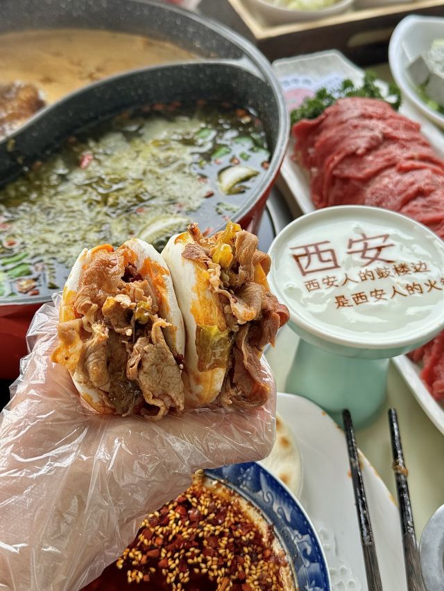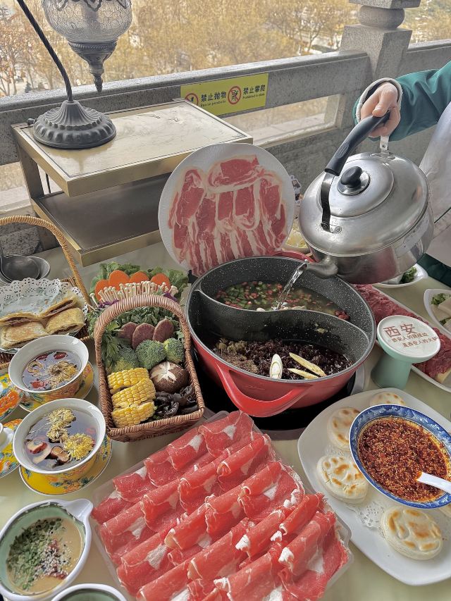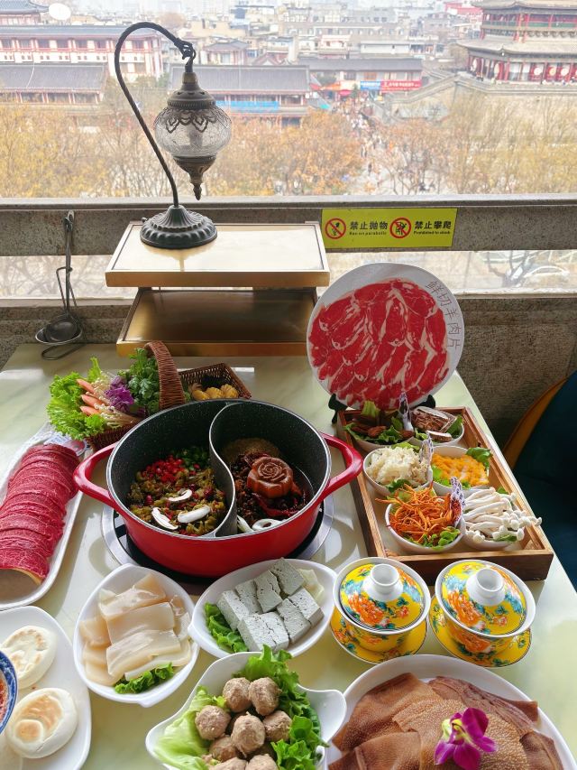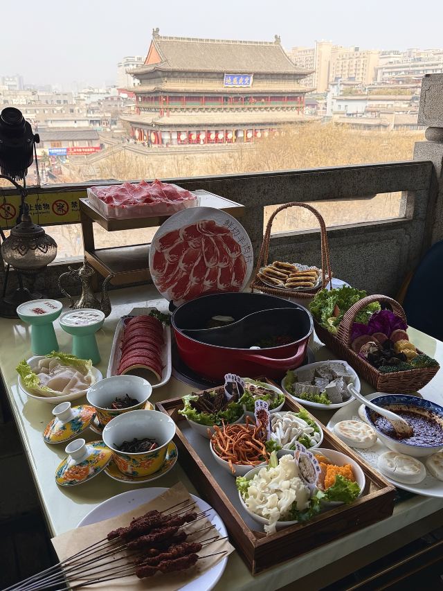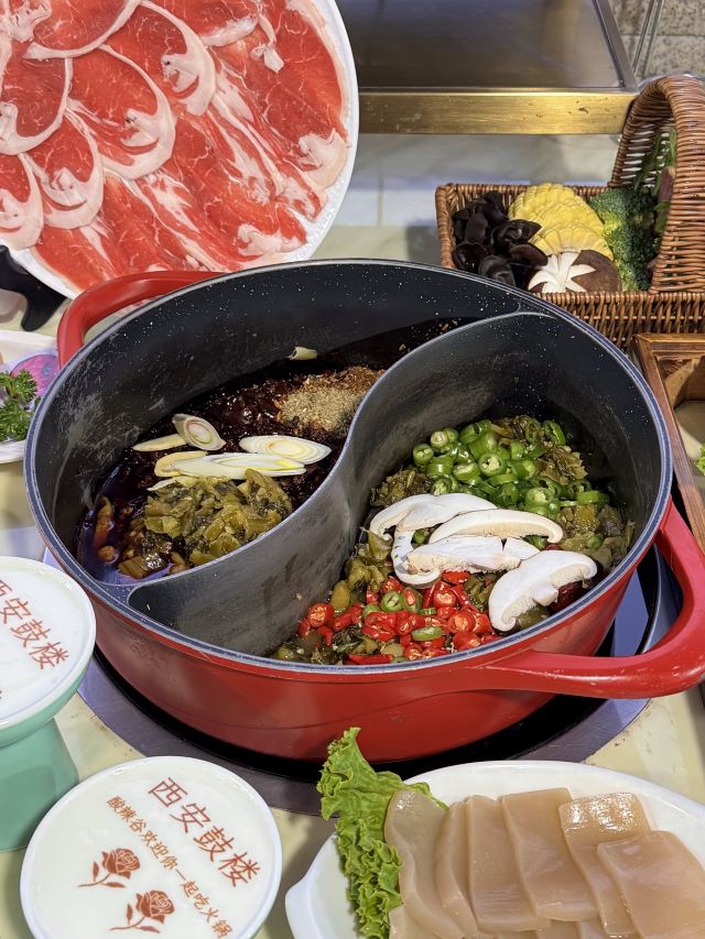 HOT & PICKLED VALLEY HOTPOT(HALAL RESTURANT)没人能拒绝在鼓楼旁边,一边涮肉一边看城墙鼓楼🌆 不是网红店,是真·土著私藏,十年了还是顶流水准! 锅底闭眼点麻辣孜然+酸菜双拼🍲 孜然香浓郁,酸菜解腻又提鲜,涮羊肉一点膻味都没有 现切的九秒鲜牛肉,裹上油泼辣子入口嫩滑 夹进小饼里直接封神🔥 还有印字酸奶、各种地道陕西小吃