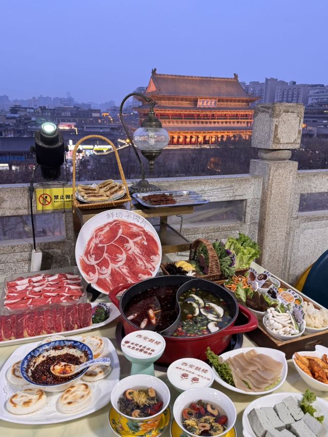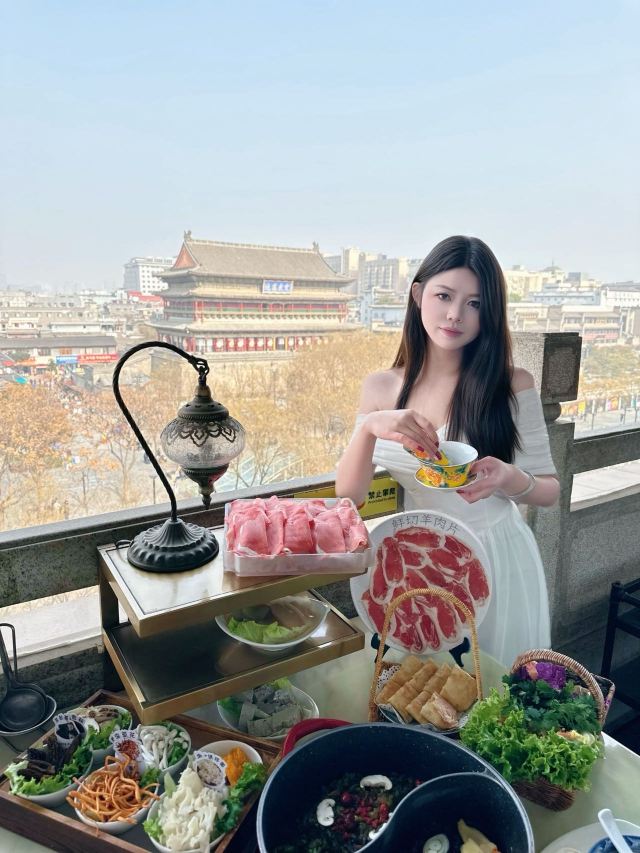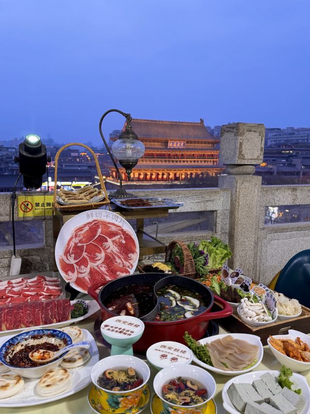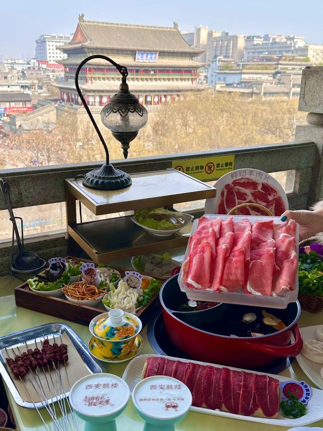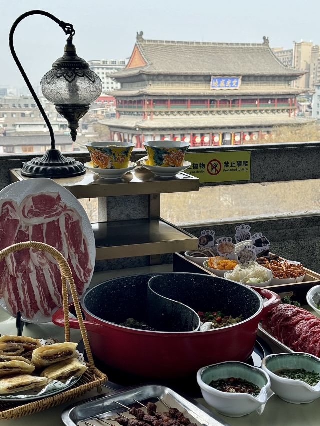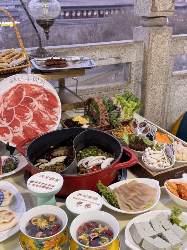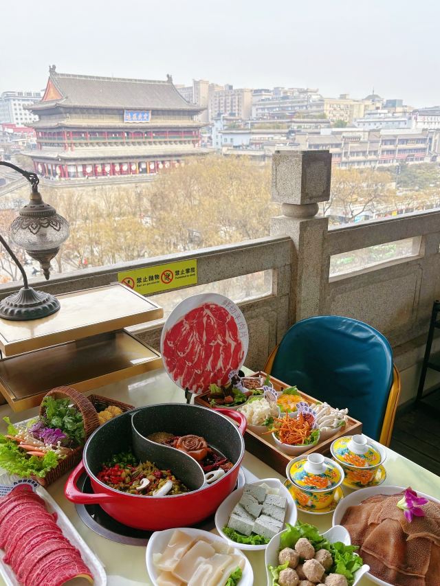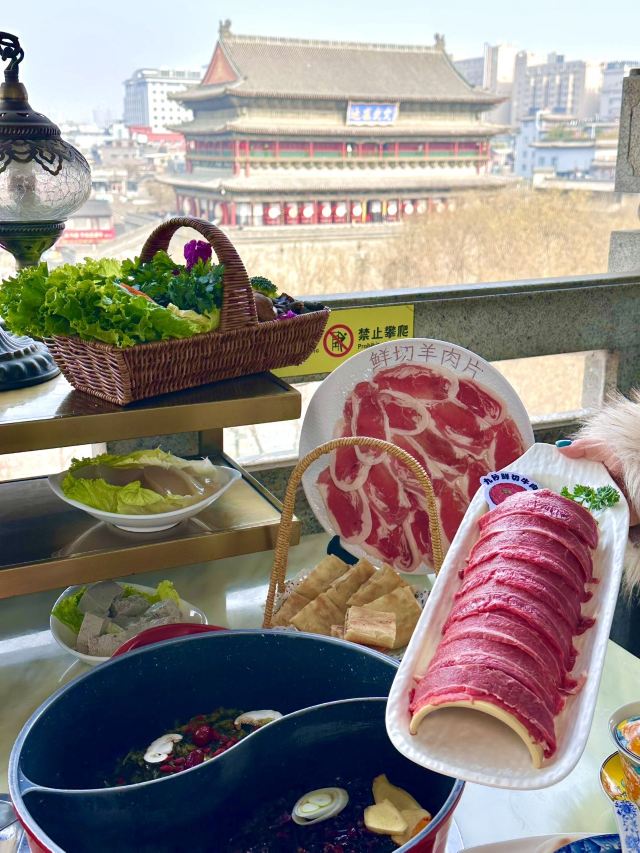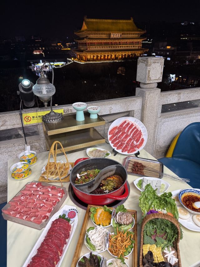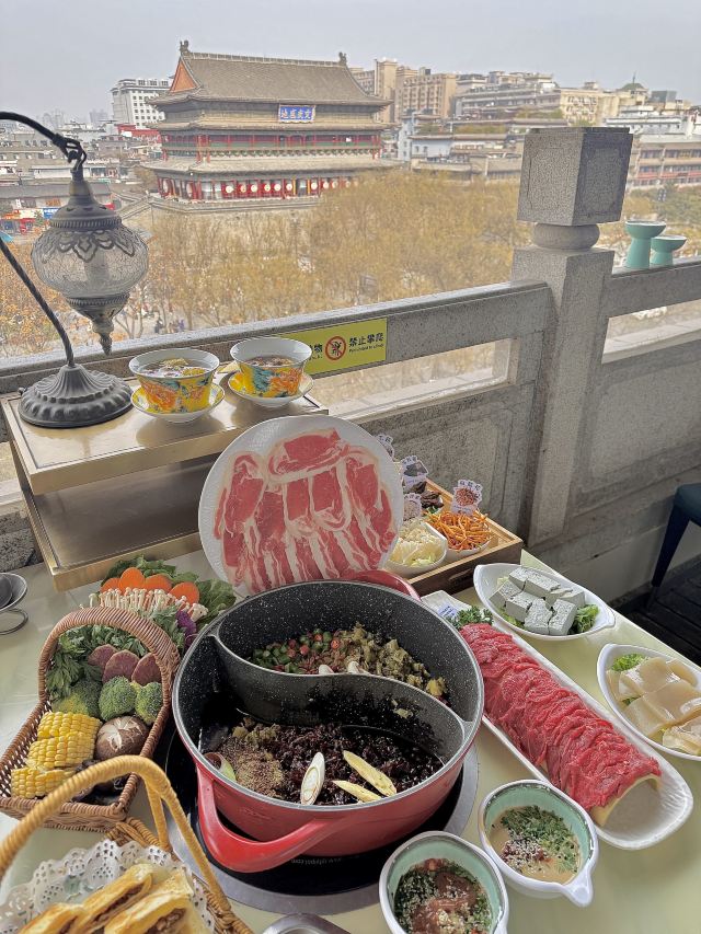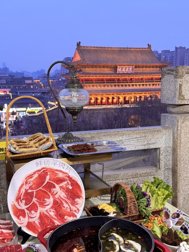 自嗨怪对着鼓楼吃火锅也太幸福了吧😭 今天快乐是火锅给的🍲⋅𐙚ྀ 🥄˚₊✯͡ 在西安挖到一家观景位封神的火锅‼️ 就在钟鼓楼旁边🌃 坐在户外平台吃饭,抬头就是鼓楼 傍晚灯一亮,氛围感直接拉满✨ 吃饭拍照两不误,随手拍都巨出片📸 是清真火锅,肉质超放心🐮 招牌麻辣孜然➕酸菜双拼锅底太绝🌶️ 孜然香辣上头,酸菜解腻开胃 妥妥陕派火锅风味~ 原切肥牛&鲜切牛上脑分量超实在🥩 新鲜又入味,涮啥都香 一定要点油泼辣子小烧饼!! 夹着肉吃香到迷糊🤤 在市中心一边看古迹一边涮火锅 体验真的很特别 来西安旅游的姐妹直接冲这家 旁边很多做汉服妆造的 穿上汉服在这拍照绝了 景观好➕肉质好➕味道正👍 #西安清真火锅 #西安美食 #西安旅游 #过年去哪吃 #陕派火锅 #西安火锅 #西安探店
