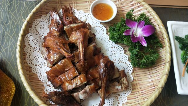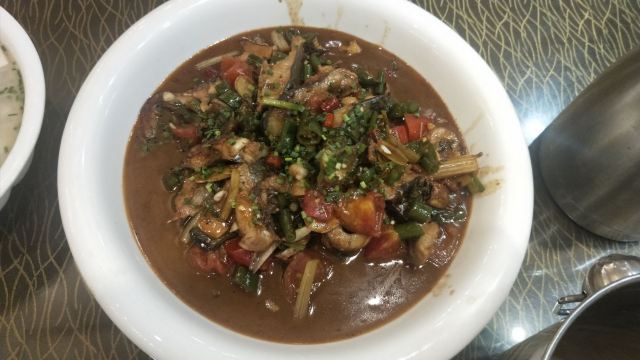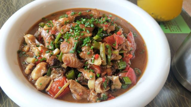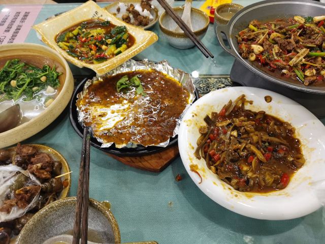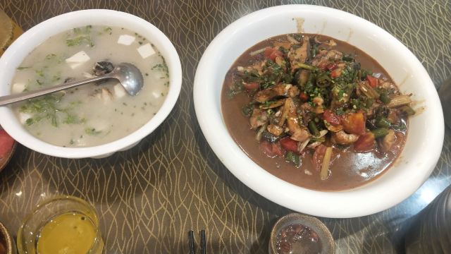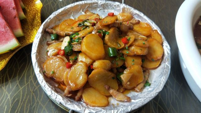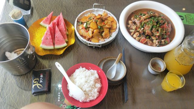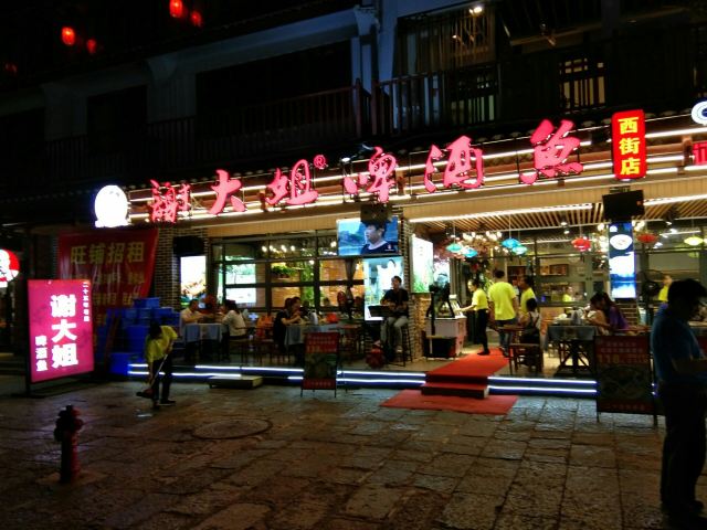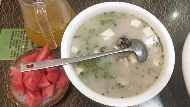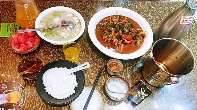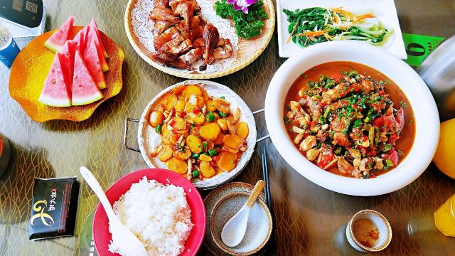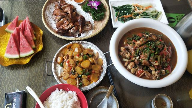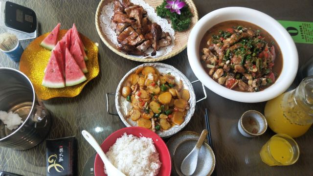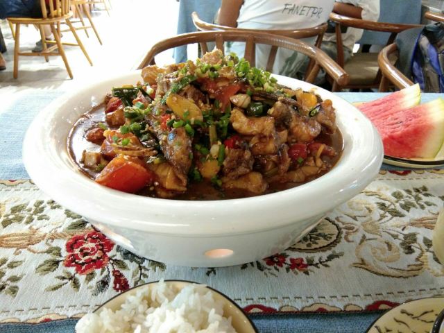 在西街满满的做啤酒鱼的店里,这家名气很响。鱼有多种选择,草鱼、剑齿鱼都可以。鱼肉鲜嫩,鱼汤口味较重,味道吃起来特别有层次。苦瓜酿也很不错,多尝尝当地特色。