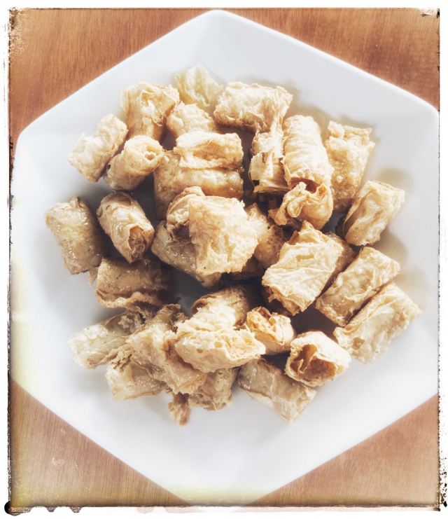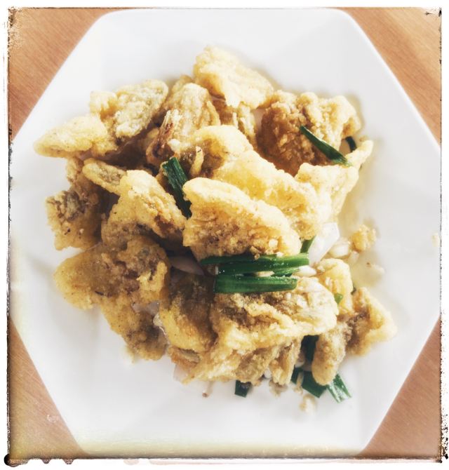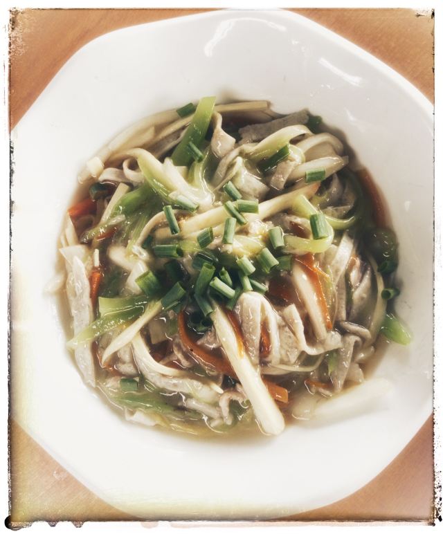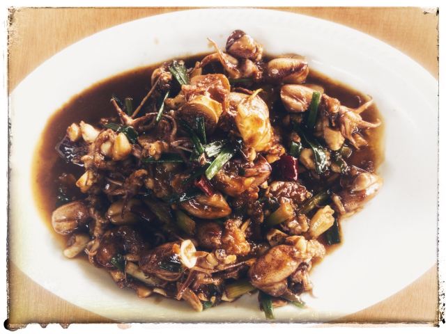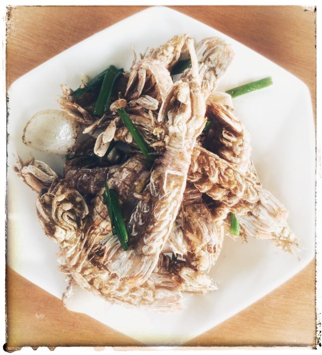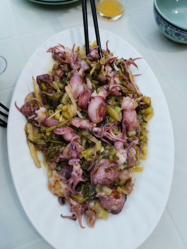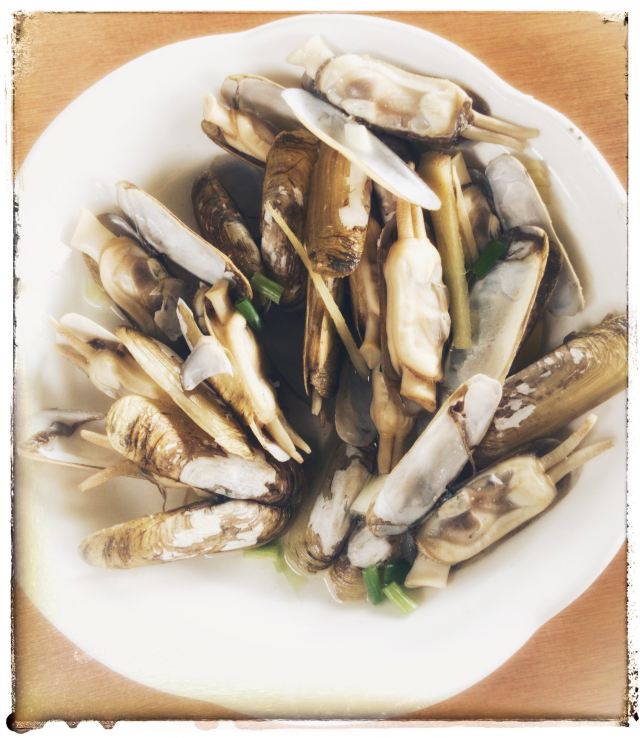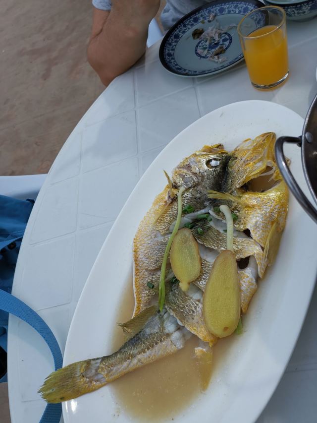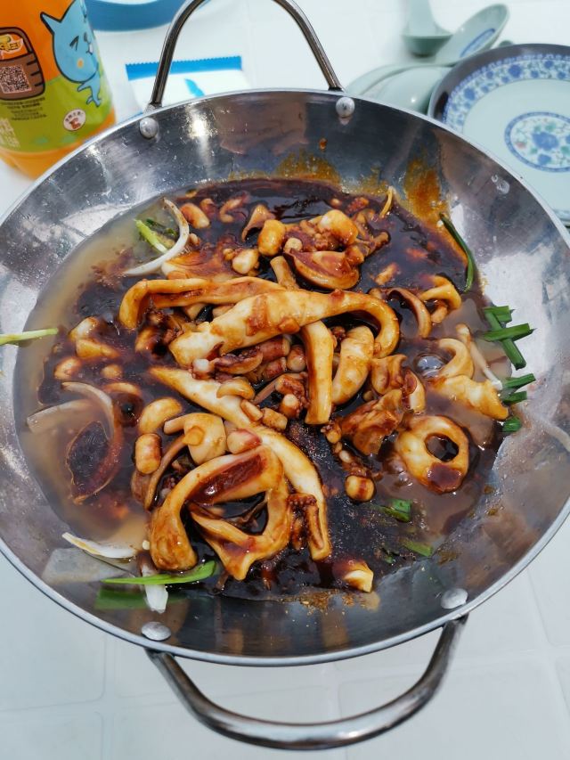 是海鲜:清蒸淡菜、盐水杂螺、芹菜炒鱿鱼、清蒸濑尿虾、盐水基围虾、大蒜炒青蟹、蒸比目鱼、鲳鱼、大蒜炒鲜泥螺、小黄鱼、铁板蛏子、椒盐小白龙(即豆腐鱼)、辣炒长螺、炒鱼丸鱼面筋等。 据说这面是将马鲛鱼刮出的鱼蓉制作而成的,还是当地人家办喜事时必备的一道菜呢。 馄饨:煮好后晾干晾凉的。皮子薄薄的,隐约可以看见馅料。馅以素为主,主要有豆腐干、炒蛋等。