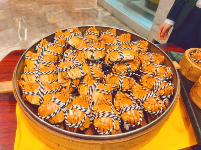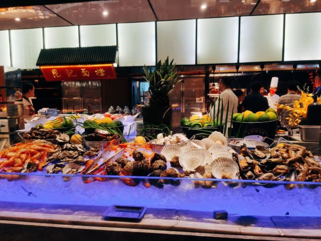 阳春香汤煮混沌,三文鱼,羊排,冰淇淋,铁板,冷菜,蟹脚,四季水果秀拼盘,黑椒京葱爆肥牛,申城喜烤麸,板栗马蹄荷香鸡