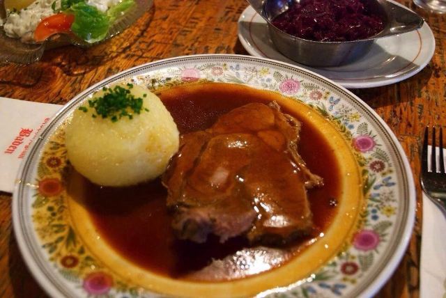 这家餐厅创业于1703年,是家300多年的老店了。许多名人曾经来此就餐,马克吐温、俾斯麦都在这里光顾过。餐厅主打德国传统菜肴,除了猪肘、香肠等,还推荐德式水饺。