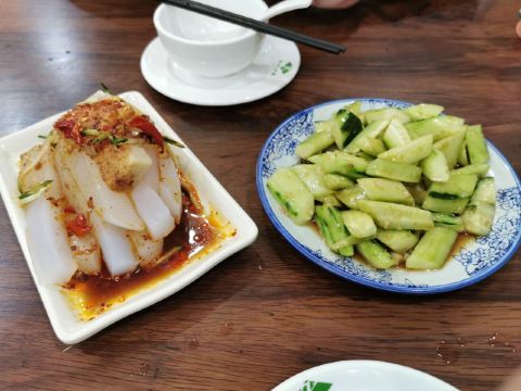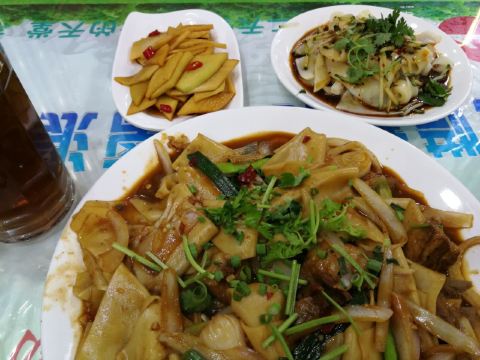 fy****234按照各种美食榜的推荐,这里都可以算的上是敦煌胡羊焖饼的排行榜前三了,在敦煌的晚餐正餐,必须要来品尝一下特色菜的胡羊焖饼,加上中午吃的驴肉黄面忒不正宗想,于是晚上一路开着导航走过来的,不过话说离市中心是稍微远了一些,离沙洲夜市也要有一段距离了。 远也有远的好处,游客会少一些,能有位子。坐下来之后,点了一份焖饼,外加两个小菜,西北几天吃的量真的好实在,一份焖饼足够了。 羊肉焖饼主要是肉选的好,很鲜美而且里面的羊肉没有骨头,面皮的量也很足,而且面皮很劲道,很有嚼劲。敦煌凉粉说实话比较一般,属于比较厚的凉粉,后来吃过一次各种色彩的凉皮,感觉比这个好一些。另外一份黄瓜的量也好大,本来就是当个素菜的。 服务的话还是挺不错的,老板年纪不大,全程服务也很开朗,感觉还是有些想法的,所以网上评价都挺不错,整个饭店无论是环境还是菜品都算是西北之行里很不错的,第二天晚上又在其他地方吃的焖饼就完全没法和这里比了,所以到了敦煌,还是非常值得推荐过来一试。