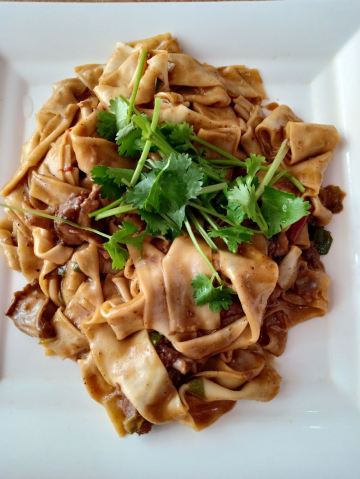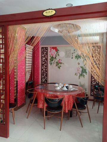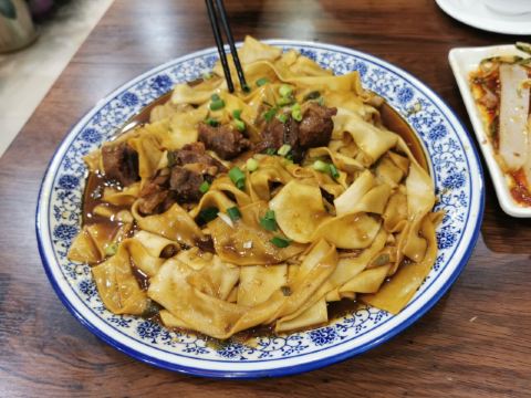 古藤幽兰胡羊焖饼,敦煌特色菜,饼其实就是宽宽的面皮,以此命名的店铺在敦煌满大街到处都有,敦煌夜市、特色小吃街不必说了,即便是随随便便走到的一条街面上,都能找得到吃胡羊焖饼的地方。寻思了一下,还是决定来到这家据说基本都是外地游客才会光临的名店,反正只吃这一回,豁上咯 。顺着敦煌特色小吃街一直朝西走,在市场巷里,马路左手边,紧邻滨河世纪家园小区大门,店面真不算小,招牌真不算大,还悬挂有两个也不甚大的红灯笼,风中摇曳。中午时分,空的很,找了个靠窗的沙发座,看了看菜单,价格已经略有上浮,说明生意日隆,游客还是给面子的,毕竟再来敦煌的几率太小了。点了一份羊肉焖饼,单人份,38,能有单人份就已经很人性化了,感谢老板的仁慈,否则小份也要68咧,贵贱不论,关键是吃不掉,浪费,吃撑了,伤身,另外每桌还赠送一小盘凉拌紫甘蓝,喜欢 。焖饼稍稍等了一小会儿,端上来后让老妈先吃羊肉,能有五六块呢,蛮大,有的略带骨头,有的带筋,有的带肥肉,都很软烂,老人的牙口都能吃,味道甚是鲜美,虽有羊膻味,一点儿不冲,可以接受,肉味已经渗入到面皮里,所以面皮既筋道爽滑又鲜香入味,确实经典,凉拌紫甘蓝,也很不错,脆生生的口感,略硬恰恰说明新鲜,不咸不辣不油,正正好,解腻,非常可口的一顿午餐。满意而归。
