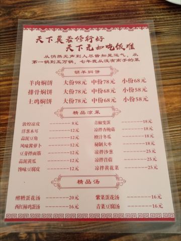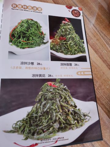胡羊焖饼,羊肉焖饼,杏皮水,沙葱炒鸡蛋,手抓羊肉,敦煌酿皮,啤酒,凉拌沙葱,凉拌甘蓝菜,凉拌苦菊,酿皮子,拌沙葱,面筋菠菜,酒酿汤,洋葱木耳,酿皮,土鸡肉焖饼,洋葱木耳拌豆腐皮,凉拌豆腐皮,果啤,豆芽拌面筋,凉拌娃娃菜,紫甘蓝,黄河啤酒,排骨焖饼,沙漠苜蓿,黄河豪麦啤酒,大漠土鸡焖饼,孜然羊肉,蒜泥黄瓜