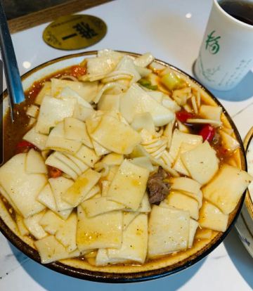 烟雨蒙蒙细雨飘飘有点像羊排面的感觉,点的菜也一样,不过这个焖饼里的羊肉,不是特别酥烂,有点爵劲,软趴趴,很入味,没什么膻味,饼皮没什么劲道,饼皮包裹着羊排的汤汁,特别新鲜感一些。
