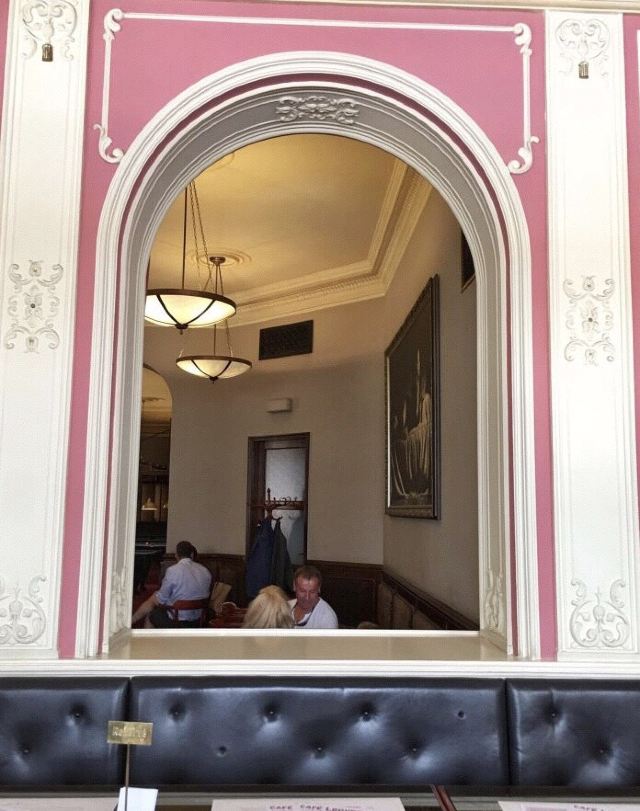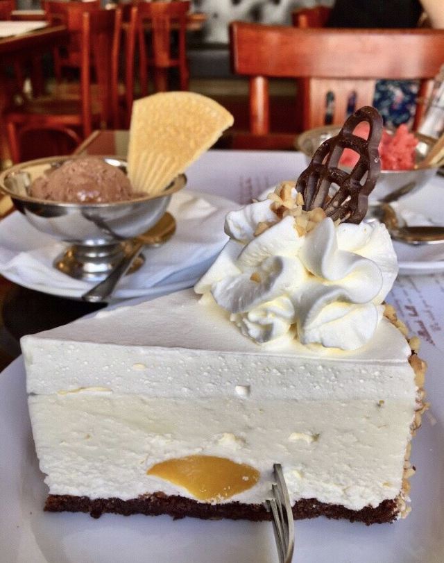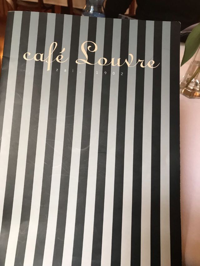 CAFÉ LOUVRE布拉格最具盛名的咖啡店Cafe Louvre与法国卢浮宫同名,已经有100多年的历史了。 9 Narodni 22, Prague , Czech Republic Cafe Louvre曾经是爱因斯坦和卡夫卡经常光顾的咖啡厅,周董也来这家打卡。 六月底打卡,大热天逛好老城精疲力尽,小伙伴们还要去别的地方,我急需一顿下午茶,一个人来到cafe Louvre, 12点半,过了饭点人不多,大量空位。 点了cappuccino,芝士蛋糕,炸猪排,冰淇淋,一个人吃撑400多克朗,130多元人民币,捷克物价比起,上海便宜多了。 买单可以用捷克克朗(kc) ,100kc=30人 民币,我没有换捷克克朗,直接欧元结算。 自认爱吃甜食,Louvre cheesecake真的爱不起来,可能天热的原因,觉得又甜又腻,不是我爱吃的芝士蛋糕的味道,cappuccino 味道淡。炸猪排量小精致,正合适我一人食。冰淇淋太甜。