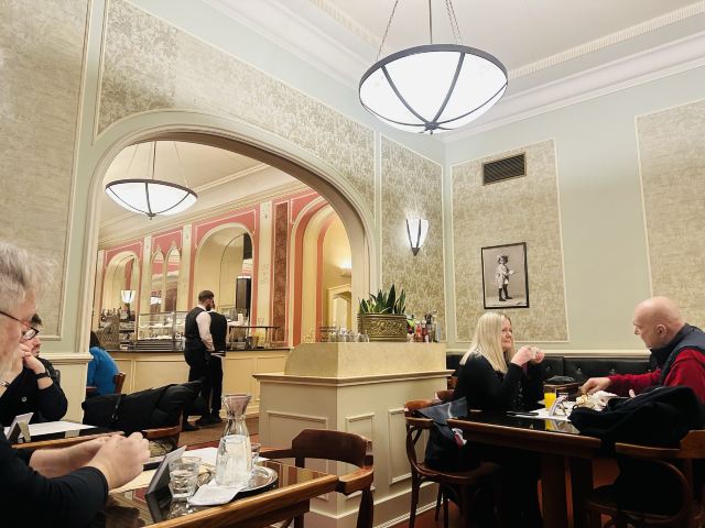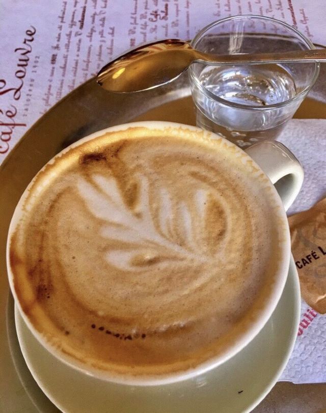 YoYo_4R6Z2E5O布拉格最具盛名的咖啡店Cafe Louvre与法国卢浮宫同名,已经有100多年的历史了。 9 Narodni 22, Prague , Czech Republic Cafe Louvre曾经是爱因斯坦和卡夫卡经常光顾的咖啡厅,周董也来这家打卡。 六月底打卡,大热天逛好老城精疲力尽,小伙伴们还要去别的地方,我急需一顿下午茶,一个人来到cafe Louvre, 12点半,过了饭点人不多,大量空位。 点了cappuccino,芝士蛋糕,炸猪排,冰淇淋,一个人吃撑400多克朗,130多元人民币,捷克物价比起,上海便宜多了。 买单可以用捷克克朗(kc) ,100kc=30人 民币,我没有换捷克克朗,直接欧元结算。 自认爱吃甜食,Louvre cheesecake真的爱不起来,可能天热的原因,觉得又甜又腻,不是我爱吃的芝士蛋糕的味道,cappuccino 味道淡。炸猪排量小精致,正合适我一人食。冰淇淋太甜。