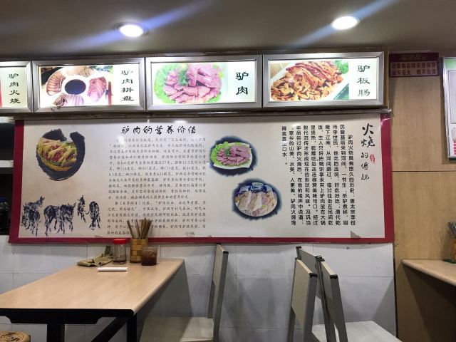 HE JIAN ZHENG ZONG LV ROU HUO SHAO GU LOU DIAN鼓楼这家驴肉火烧似乎开了很多年,驴肉火烧这种特色小吃宁波好像还真不知道有第二家的,华北地区非常流行,南方这边好像对此并无兴趣 驴肉火烧有2种,圆形的保定驴肉火烧,长方形的河间驴肉火烧 原本以为驴肉火烧也就是卤好的驴肉伴着老汤汁加入酥脆的火烧里面,其实还能玩出很多花样的,加驴肠的板肠火烧、加驴皮冻的焖子火烧,还有不夹肉的白皮火烧,驴心、驴肚、驴杂、蹄筋等等,都能做各种料理 一个多加肉的火烧和一个焖子火烧,其实第一次吃,也没吃出个所以然来,就觉得火烧很酥脆,里面的驴肉味道比较淡,肉汁很少,所以配了碗驴清汤,汤是很鲜,热腾腾的,冬天喝正好 驴肉低脂高蛋白,而且还有补血、补气、补虚的功效,是优质肉类,不过江浙地区除了阿胶,对驴肉兴趣寥寥