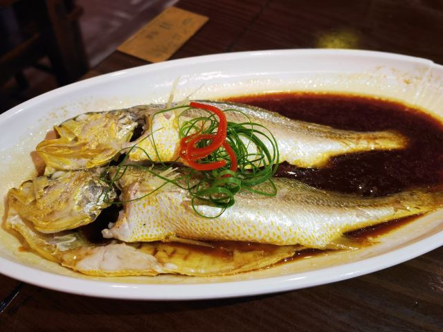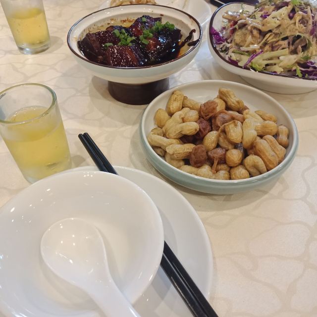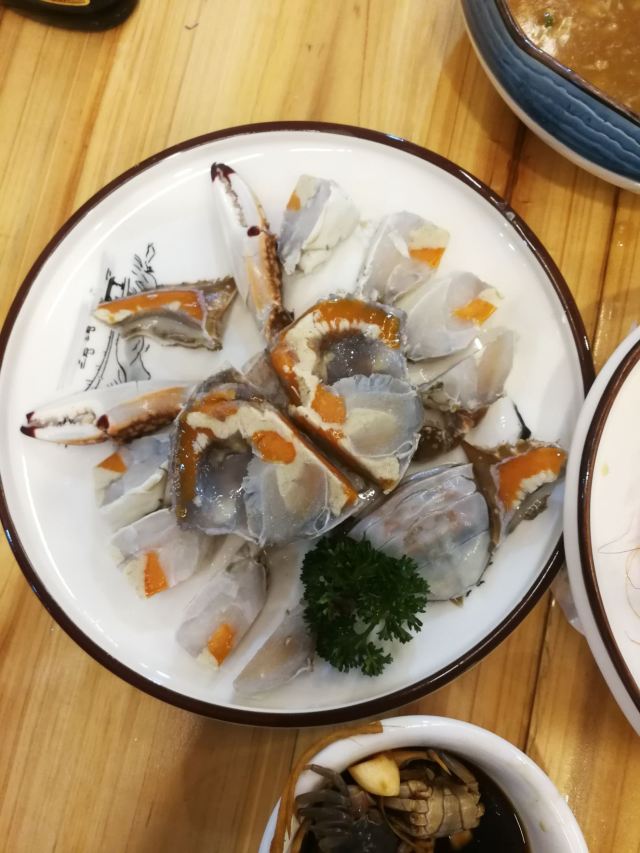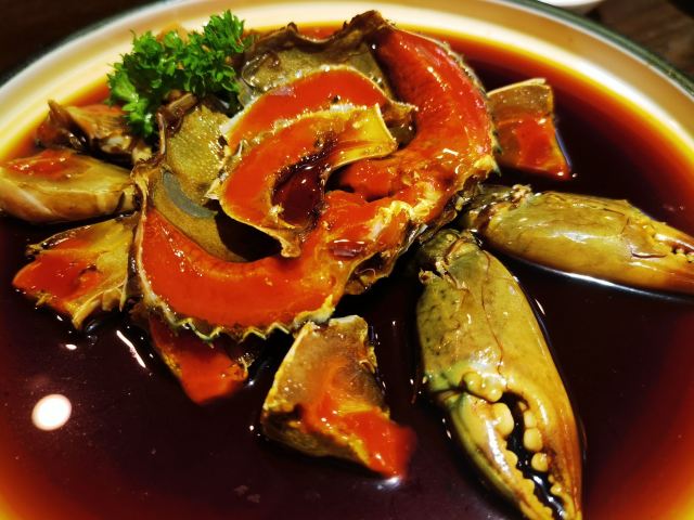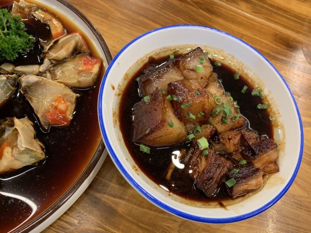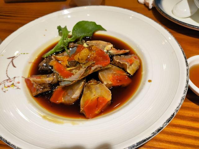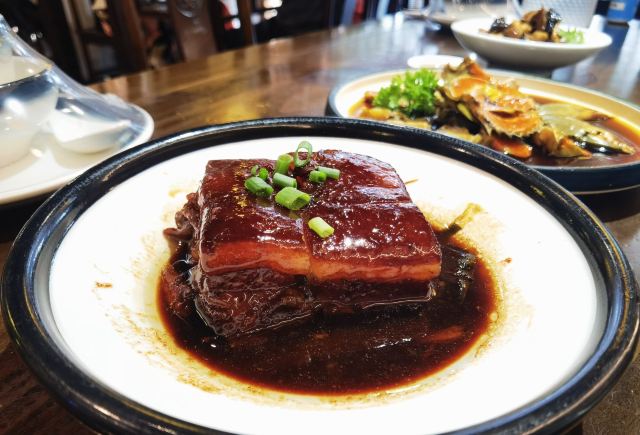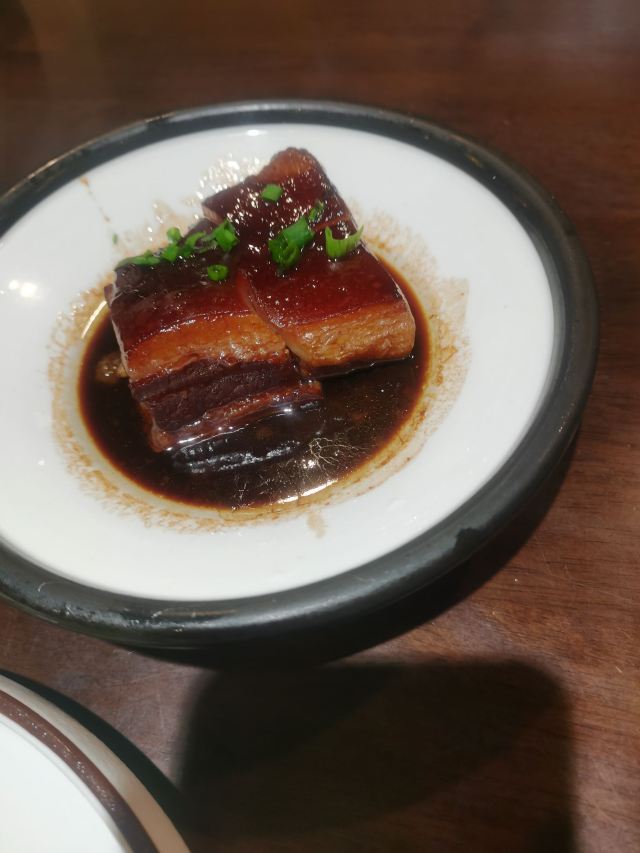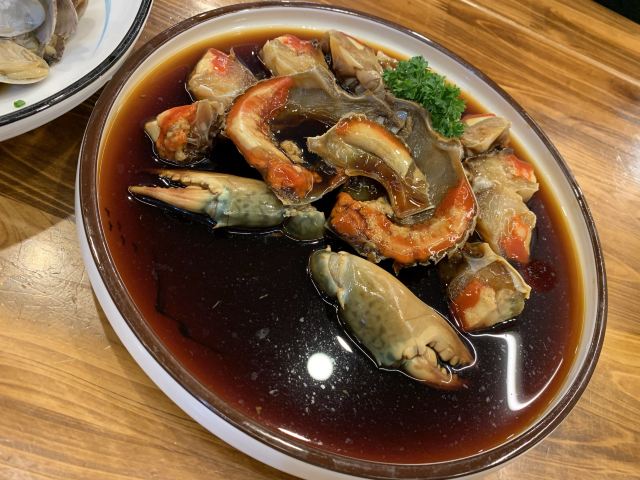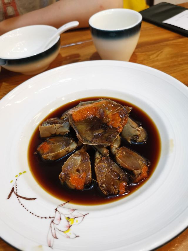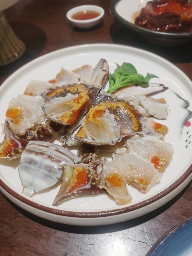 阿拉名灶店子不大,桌椅摆得有些拥挤,装修也有些显旧了,但却有一种烟火气息,看得出来应该是周边居民常来的一家店。 点了几个店家销量榜前几位的菜品。东坡肉,酱香软糯,肥而不腻,入口即化;酱青蟹,生腌制成,酱浓味鲜,蟹甜膏肥,十分可口;腐皮包黄鱼,原以为是个湿菜,上来才知道是腐皮包裹拆骨黄鱼肉油炸而成,倒也酥脆鲜香,应该是个不错的下酒菜。 这几个菜十分符合文字作品对江浙菜的描述,也可以说满足了对江浙菜的味道想象,宁波菜应该就是这个味道了。