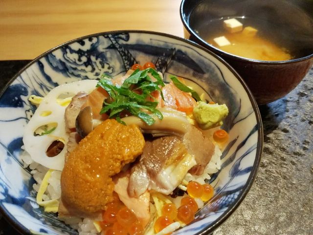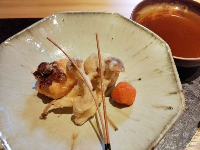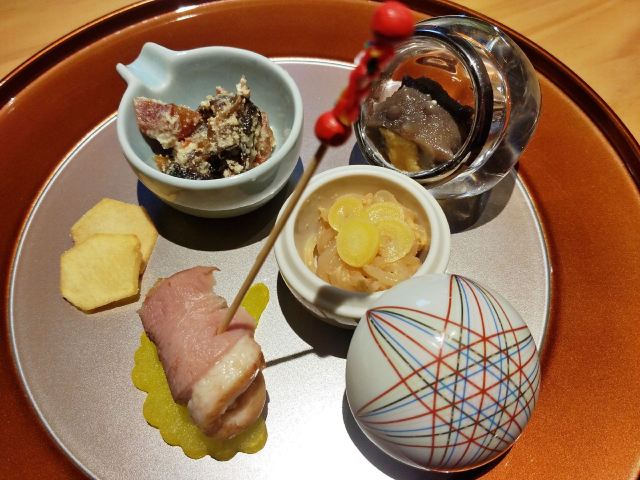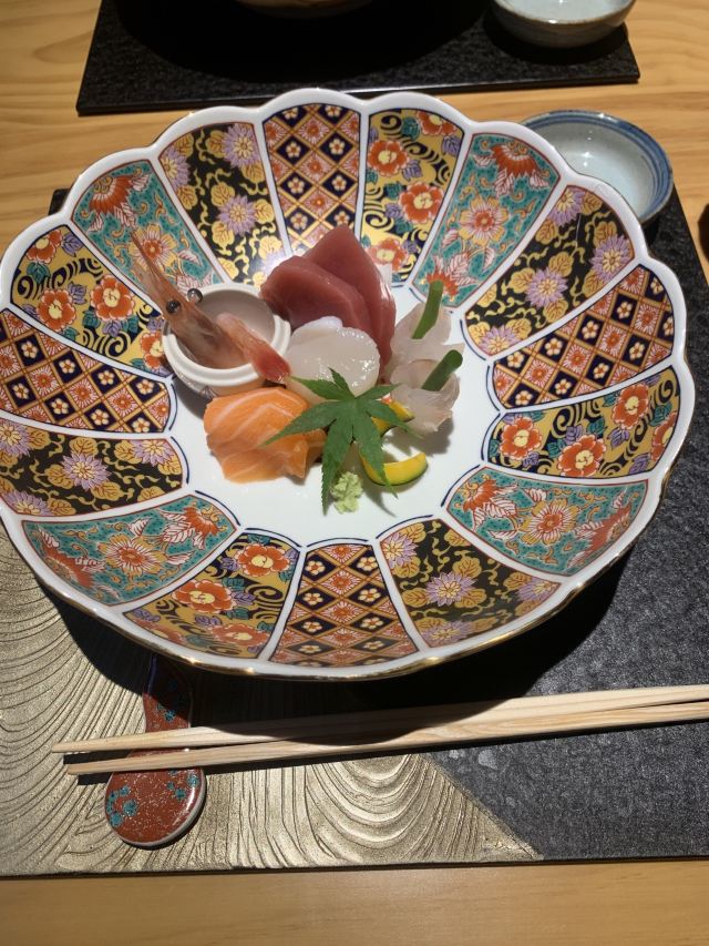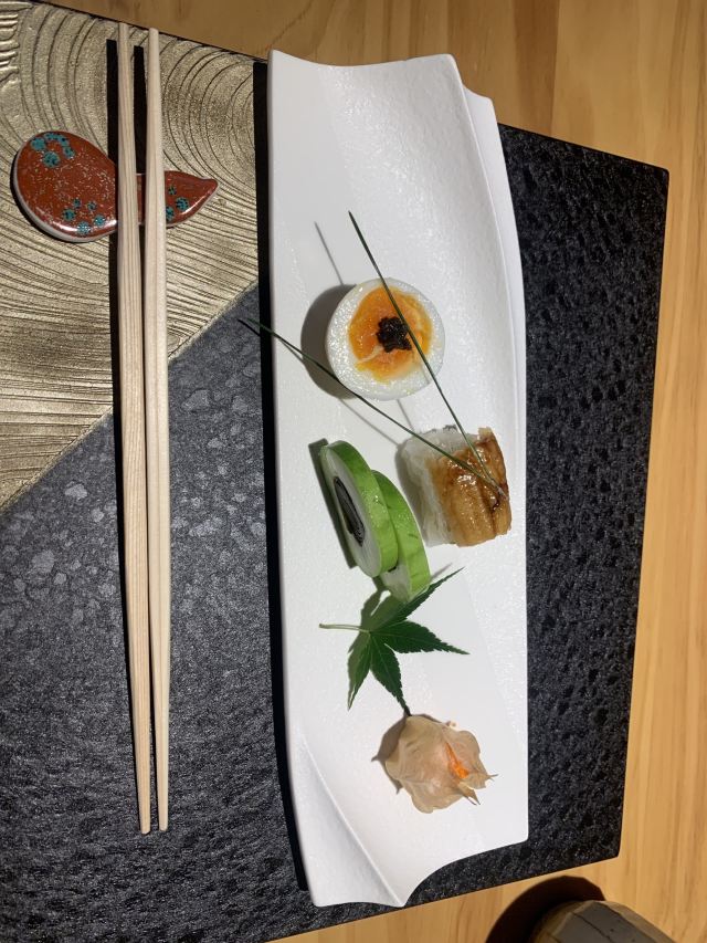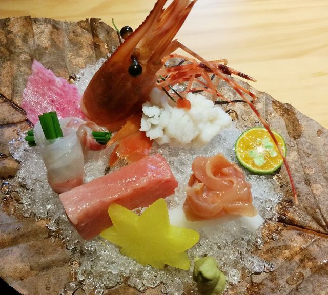 活鲷刺身,三文鱼,煮物玉子豆腐,甜虾,天妇罗炸虾,金枪鱼刺身,法式香梨布丁,鹅肝,扬物海胆萝卜丸,向付三味刺身,抹茶布丁,鹅肝寿司,虾天妇罗,三文鱼腩,烤鳗鱼,烤串拼盘,火炙寿司拼盘,味噌拉面,甜虾刺身,特制香烤鳗鱼饭