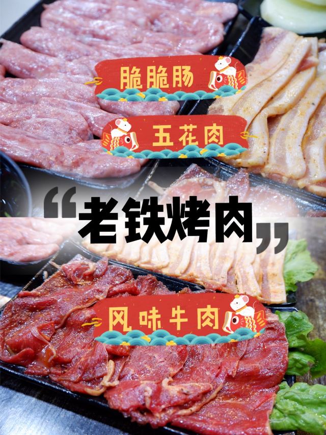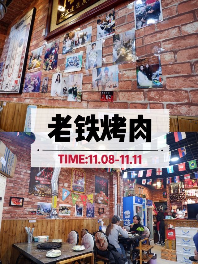 筱风姿宁波美食安利|老铁烤肉 这家店,比较特别的是 他在影视基地附近 所以 经常有明星光顾 然后 墙上贴了好多剧组来这里用餐的照片 虽然说来这里吃饭的不是特别强大的流量明星,好多都不是很认识,但这个位置还是很不错的,所以生意一直都很好。 坐标:人民北路398号(铭汇楼下、影秀城对面) 交通:地铁1号线松花江路口站B口 人均:¥80.00 营业时间:10:00–04:00(次日) 环境:店铺不大,小小的,上下两层楼,一口主打的是4人桌、楼上主要是多人桌,来聚餐烤肉倒是好地方; 服务:人多了,难免对付不过来。 「秘制五花肉」 五花肉是真的肥瘦相间,烤上以后滋滋的冒着热气 蘸酱吃特别棒! 「风味牛肉」 这是不能烤的太久,不然就老了 因为已经拌好味道了,即使没有酱汁也蛮入味的; 「脆肠」 烤脆脆肠的过程最好玩的,把脆肠慢慢的卷缩起来,彻底红透,还有油冒出来就证明好了;咬一口,有一种台湾热狗️的味道; 「生菜」「东北大冷面」 生菜是真的给了超级大一盘,吃不完~ 东北冷面长得不容易,上面漂着一层油,酸酸甜甜的冷面。