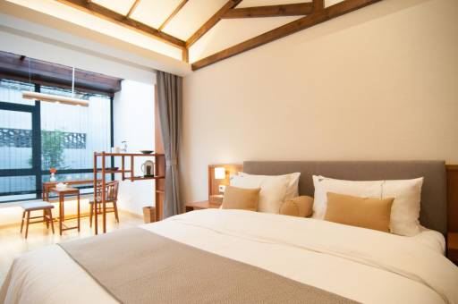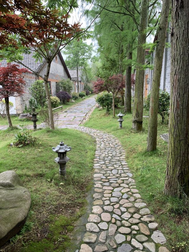花叔叔由心宿的管家领着穿过名为“序”的长廊,长廊的空间设计透露着浓浓的古风,古琴、茶几、瓷器、红色的油伞……随意地摆放两侧,一趟避世穿越之旅就这样开启。大堂名为“墨沏”,这是是心宿福泉接人待物的地方,这里有大堂吧、阅读区、下午茶区,还有孩子们的玩乐区,女服务生着粉色汉服,男服务生着黑色汉服,还有很多穿着古朴的住客,小做打扮的小M和环境简直融为一体。大堂的玻璃大窗外是一处荷花池,从大堂拐角处的小门可以进入这里,小M在这里假装抚琴、摇船,逍遥的好似真的是那个年代的一位官家公子。心宿的客房按“本心住处”顺序排列,我们被安排在本八。这里的每个客房都是独门独院,私密性很好。入住时,工作人员会让你亲手挂上平安铃,还会让你敲响铃声,以表示愉快平安。房门口围墙是用拱形黑瓦盘成镂空花窗,透过花窗能看见屋内小院里栽种的花木。房间与小院用落地玻璃窗隔离,内侧挂着一个卷帘,似有一帘幽梦的感觉。这道帘子可以隔开这个房间的空间,让出一个禅意小客厅,茶道、古玩,一器一物,让入住者感受心宿独特的人文体验:本心、恬喜、自在、清雅。 客房里床头摆放的《纸边儿》是杨葵老师已经绝版的作品,心宿的莲花壶是景德镇的青年艺术家郁小明所作,所有茶杯都是经过瓷器艺术家徐冬冬老师精心制作。在这样的环境里睡了一个午觉,醒来就看到了上文提到的下午茶点心,豆花酥、鸡蛋仔、杏仁糕、年糕片、水果等点心,还可品尝东钱湖的特色小吃手作。填饱了肚子,我们再来慢慢的感受这里的幽雅,心宿的园林景观很精致,散步在其中,眼睛都是满满的享受。特别是房间门前院子里的小池子仙气氤氲。是适合拍照的好地方。这里还依稀可以看到斑驳的标语和残破的墙壁,我想当年的知青们很难想象几间老房子蜕变成这禅茶一味的灵性空间,如今褪尽了时代浮华,经山岚雾霭滋养间,谁都不曾想成了一处尘世之外的心灵宿地。如果有缘,早起还能在院子里听到隔壁千年古刹传来的高僧诵经声。除了大大的草坪,排排的古宅,这里甚至还有足球场,网球场和篮球场,这样的配置已经大大超过了一般民宿的标准。心宿有一家简约大气的定食餐厅,取名为“善”。在这里可以吃到福泉山的山野、东钱湖的湖鲜等当季的天然食材。入住的时候提前预定,每人100(孩子不算)就可以吃上一顿搭配合理的晚餐,菜量特别大,我们一心想着不要浪费,吃到人人躺坐在椅子上,都没能消灭。想要到民宿外就餐的朋友,也可以到距离民宿5分钟车程的下水村。
