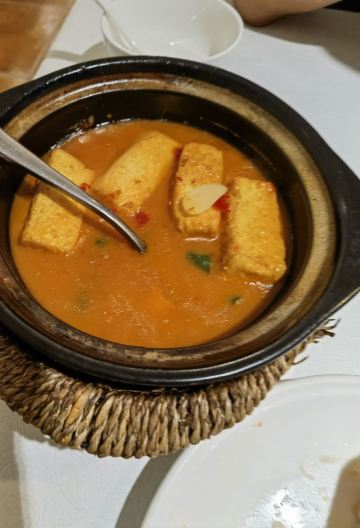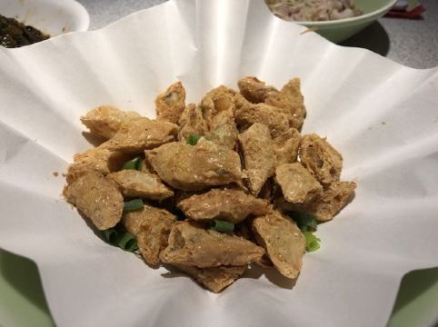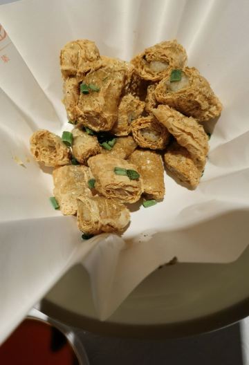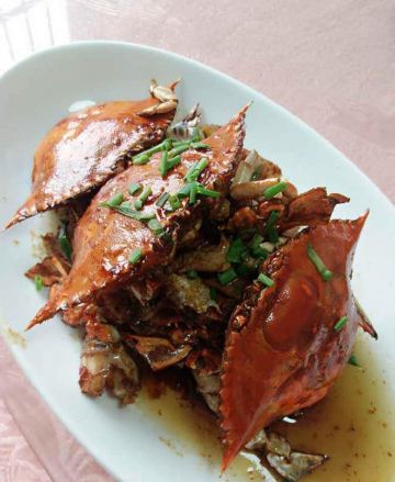 看推荐来的,从普陀回来七点半了,也许饿了的原故,三人五个菜,正好。腐皮包黄鱼又香又鲜,稍咸(个人口味,北方人);白蟹年糕也很好;宁波烤菜稍油,很好吃;酸汤肥牛非常开胃。是宁波吃的最满意的一餐。